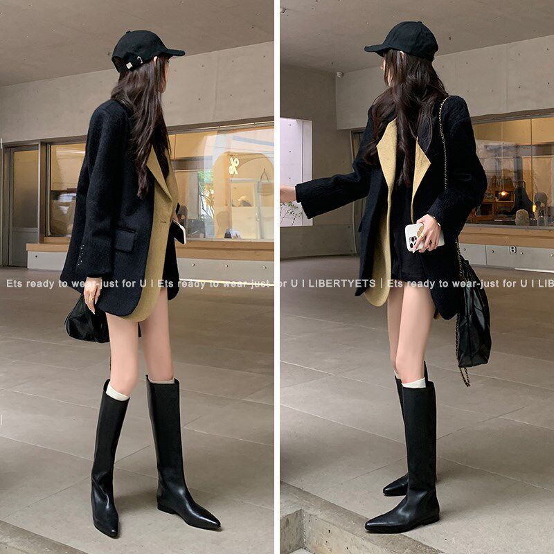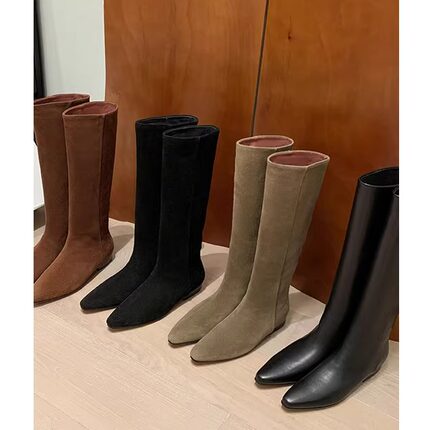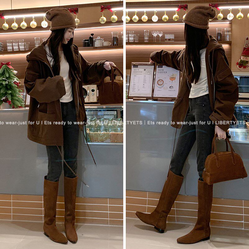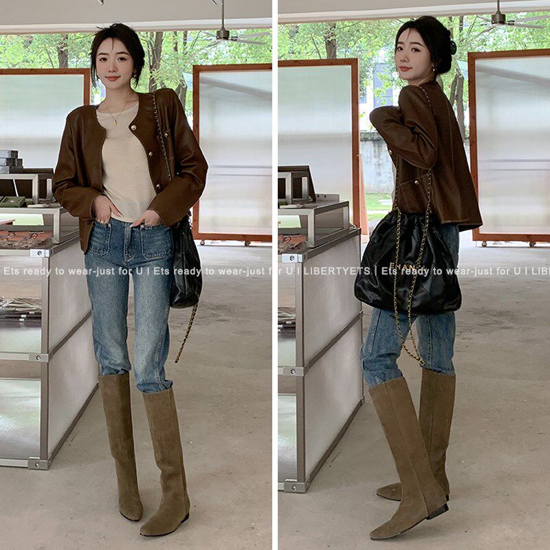 真皮法式平底翻毛皮骑士靴小个子膝下靴宽筒齐膝靴平口高筒长靴女