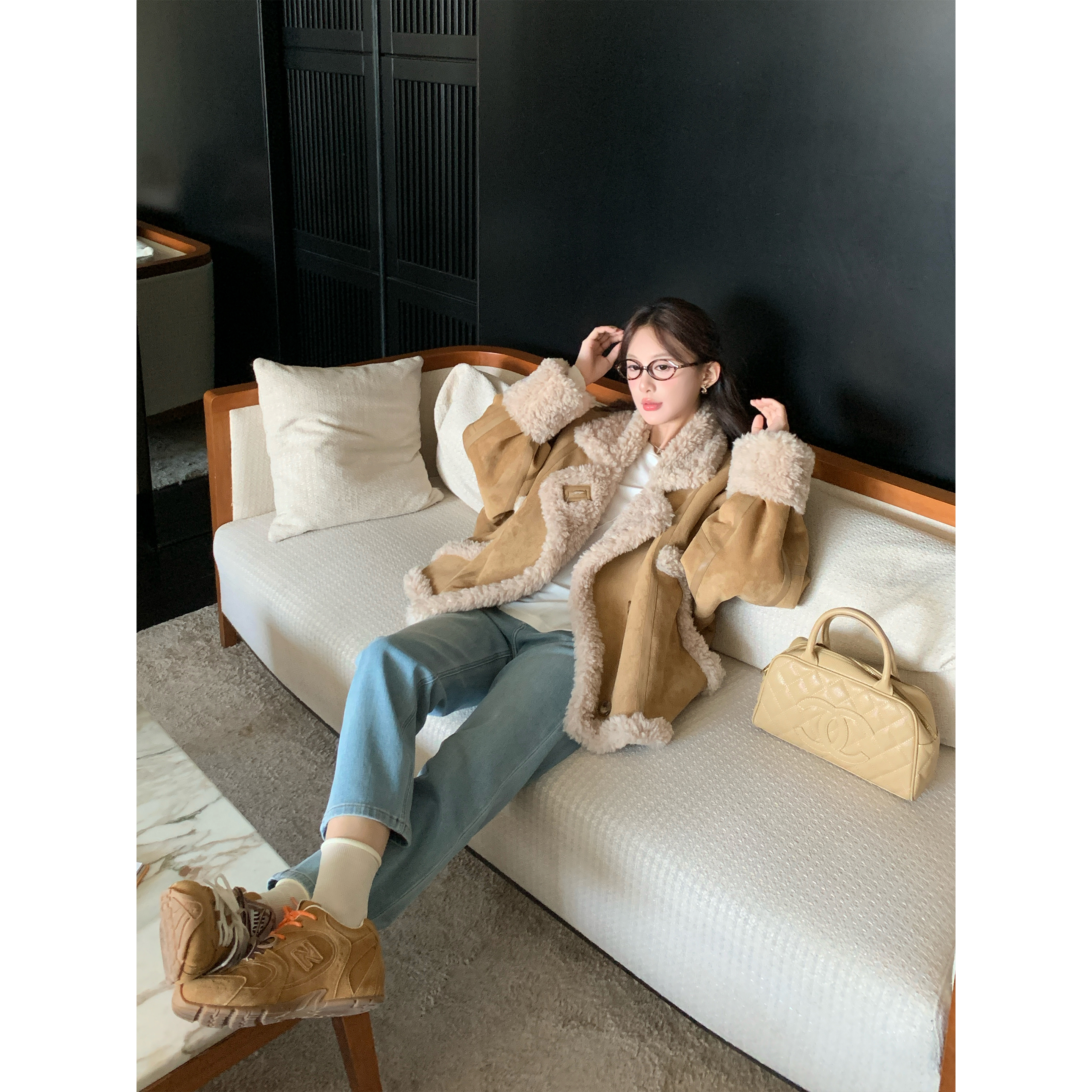 夏天家"松弛time"翻领麂皮绒羊羔毛皮毛一体加厚毛毛外套女机车服