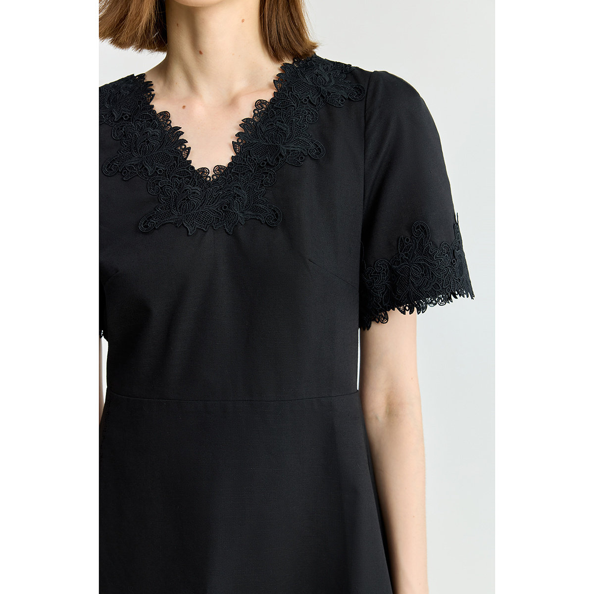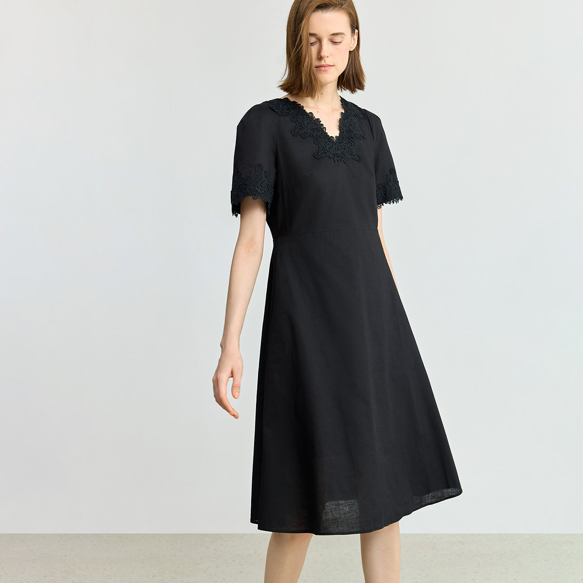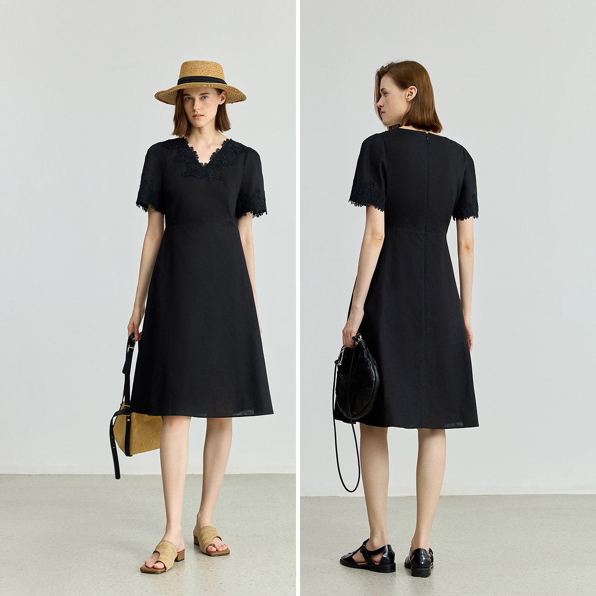 LILY2025新款棉麻法式复古镂空蕾丝泡泡袖休闲通勤黑色连衣裙女