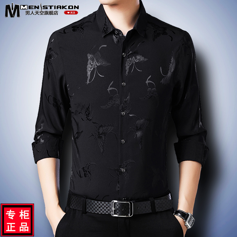 春装长袖花衬衫男士春夏季2025爸爸装丝绸衬衣男中年绸缎男装薄款