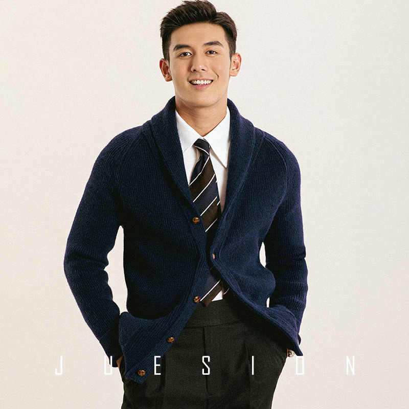JUESION 青果领针织衫毛衣外套男加厚秋冬款商务翻领男士开衫上衣