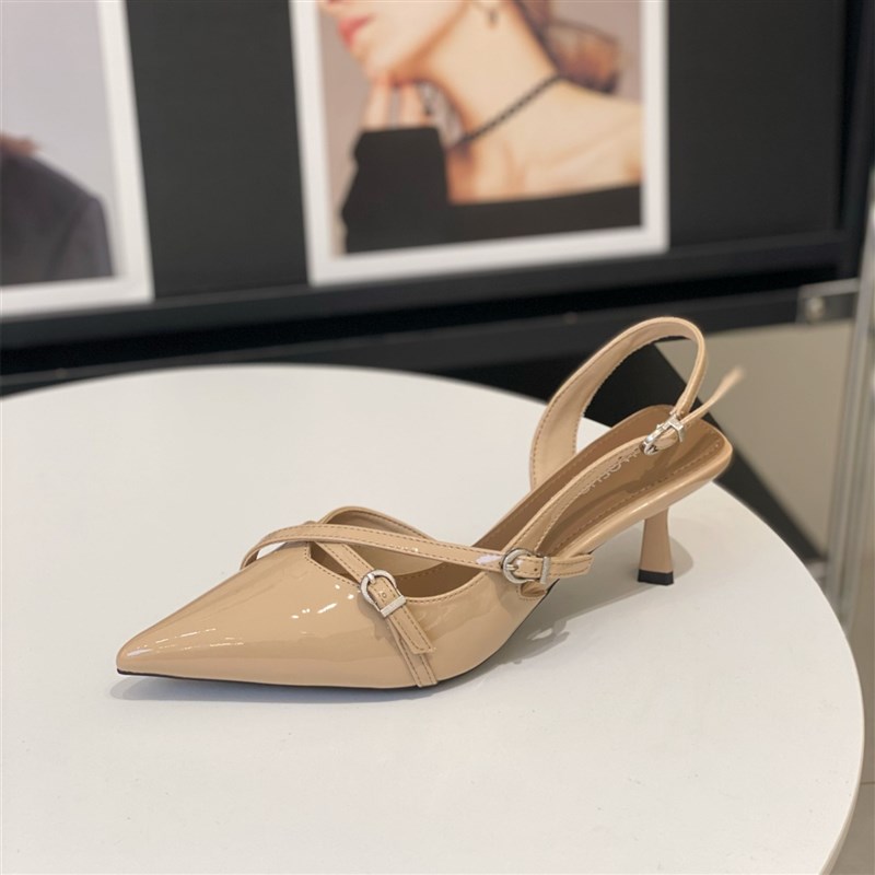 法式气质通勤漆皮凉鞋女2025夏季新款百搭尖头细跟一字扣带高跟鞋
