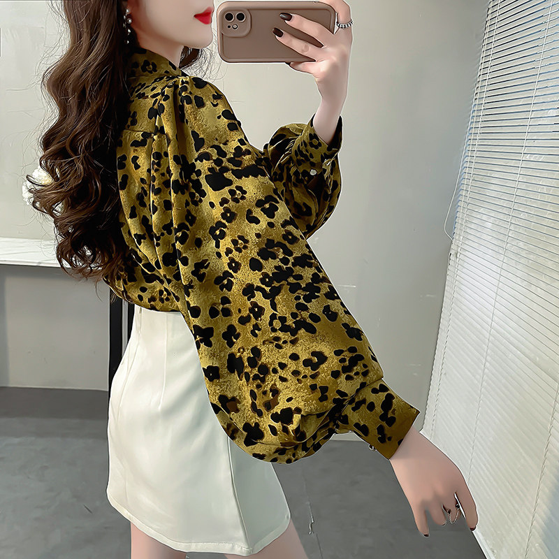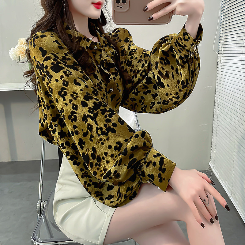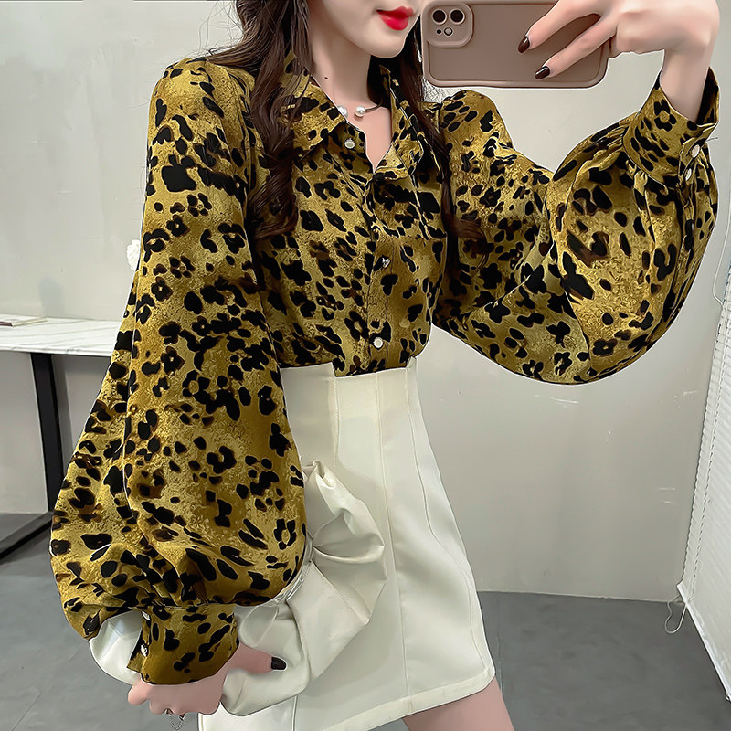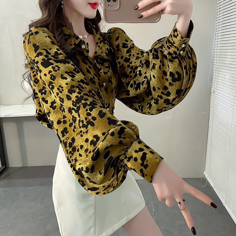 宽松长袖豹纹灯笼袖衬衫