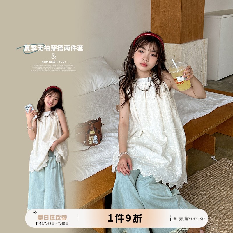 女童套装夏季2024新款儿童绣花背心上衣宽松阔腿牛仔裤两件套夏装