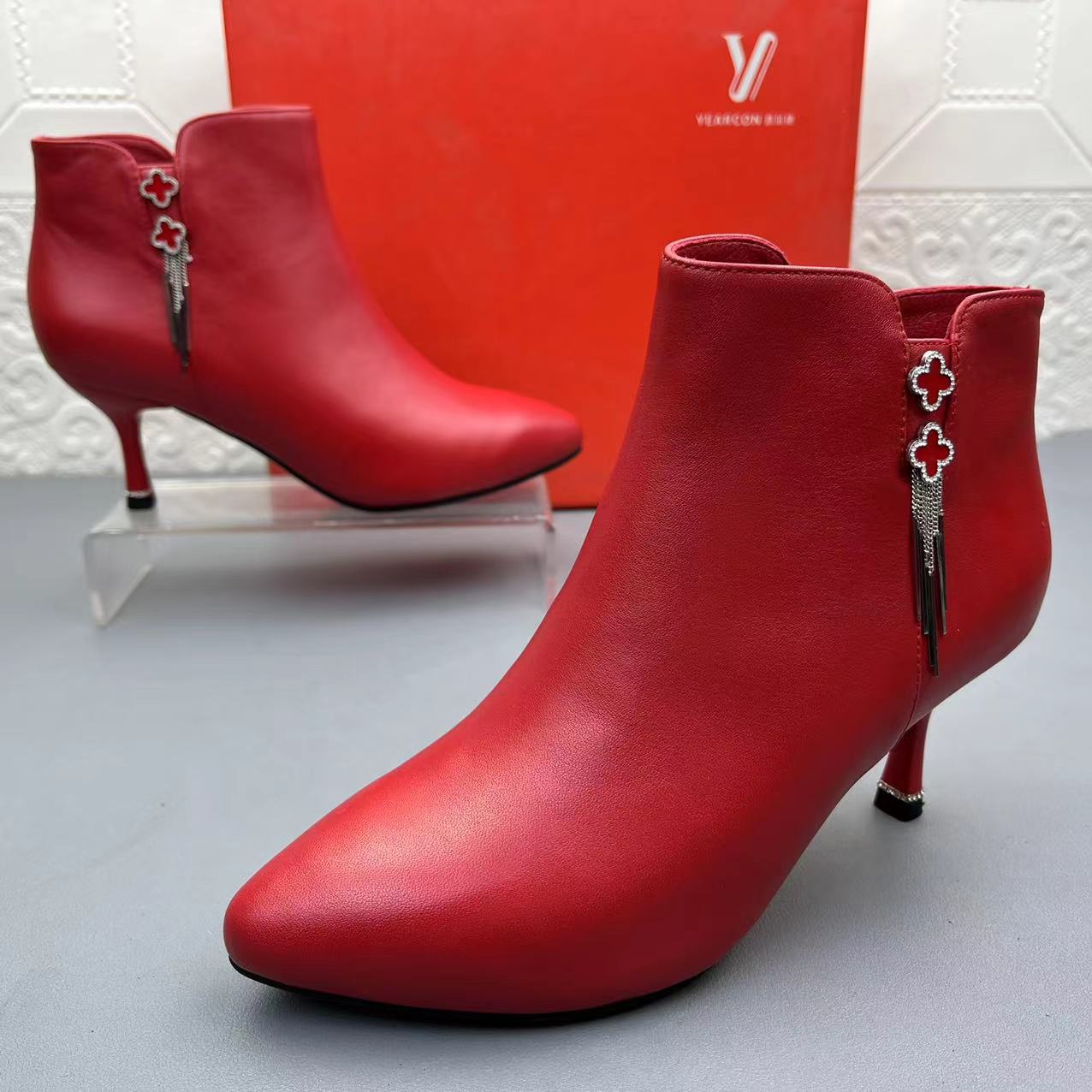 大牌撤柜断码处理头层牛皮女鞋女靴2023新款真皮高跟尖头时装短靴