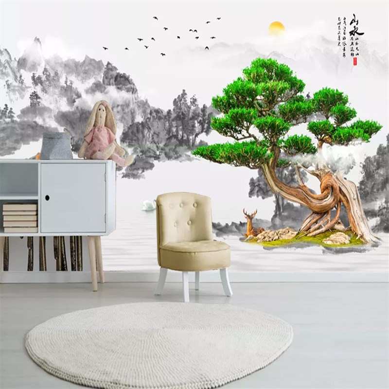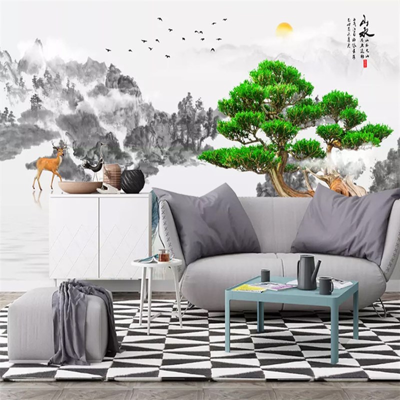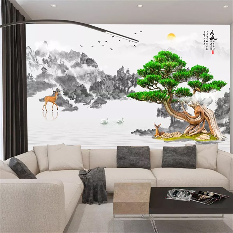 影视墙电视背景墙壁纸现代简约客厅中式壁纸迎客松壁画无缝墙布