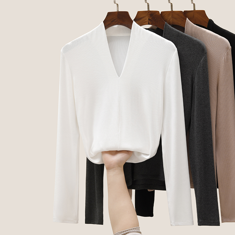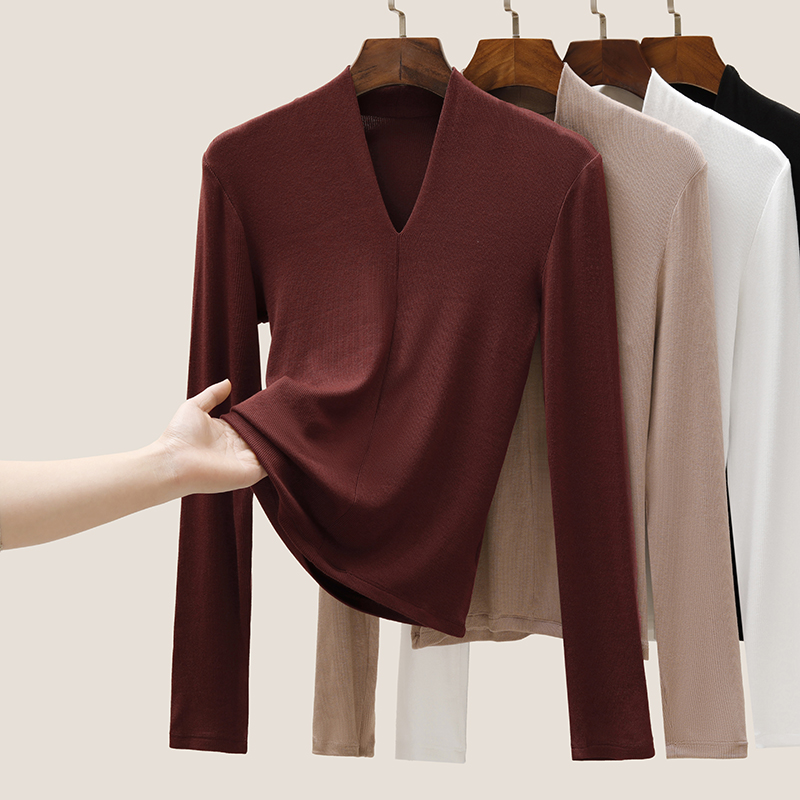 时尚小V领加绒长袖恤打底衫女冬季内搭2025新款洋气修身保暖上衣
