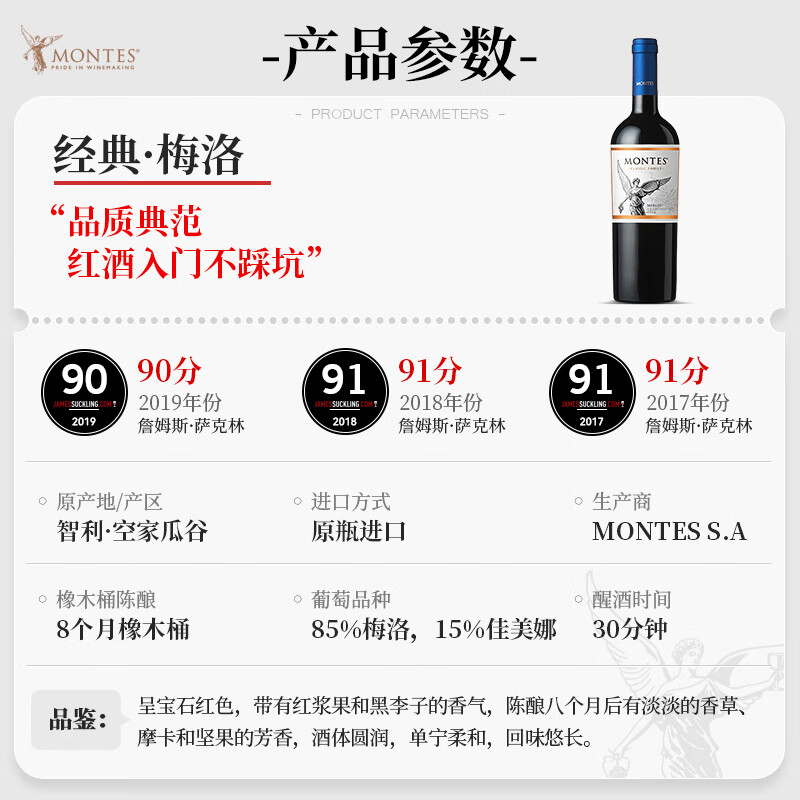 蒙特斯montes经典梅洛干红葡萄酒750ml*6智利原瓶进口 婚礼喜宴