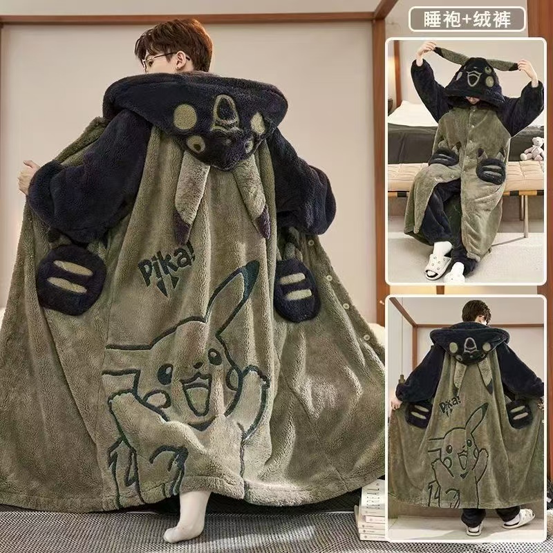 珊瑚绒男士睡袍秋冬季加厚睡衣卡通青少年加大码冬天长款浴袍套装