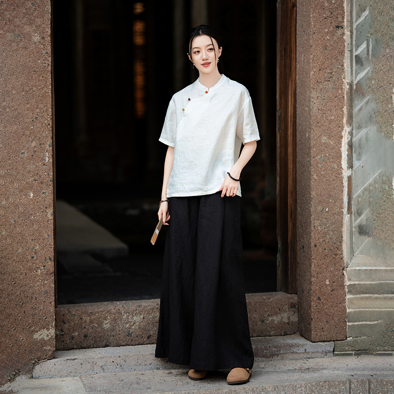 亚麻复古高腰直筒裤女夏季2025新款全麻薄款大脚口太极练功阔腿裤