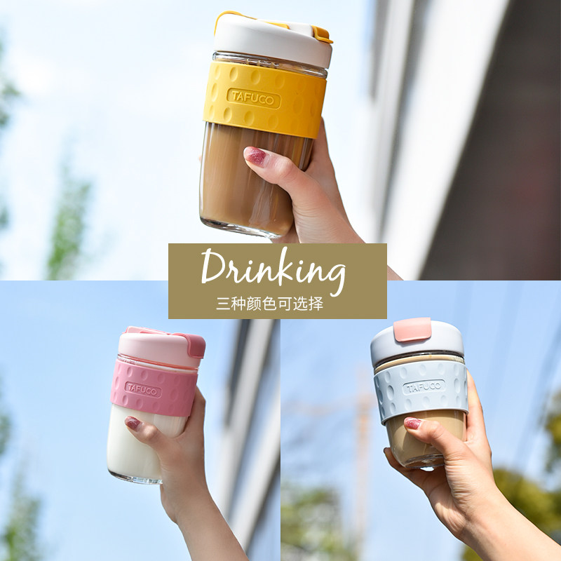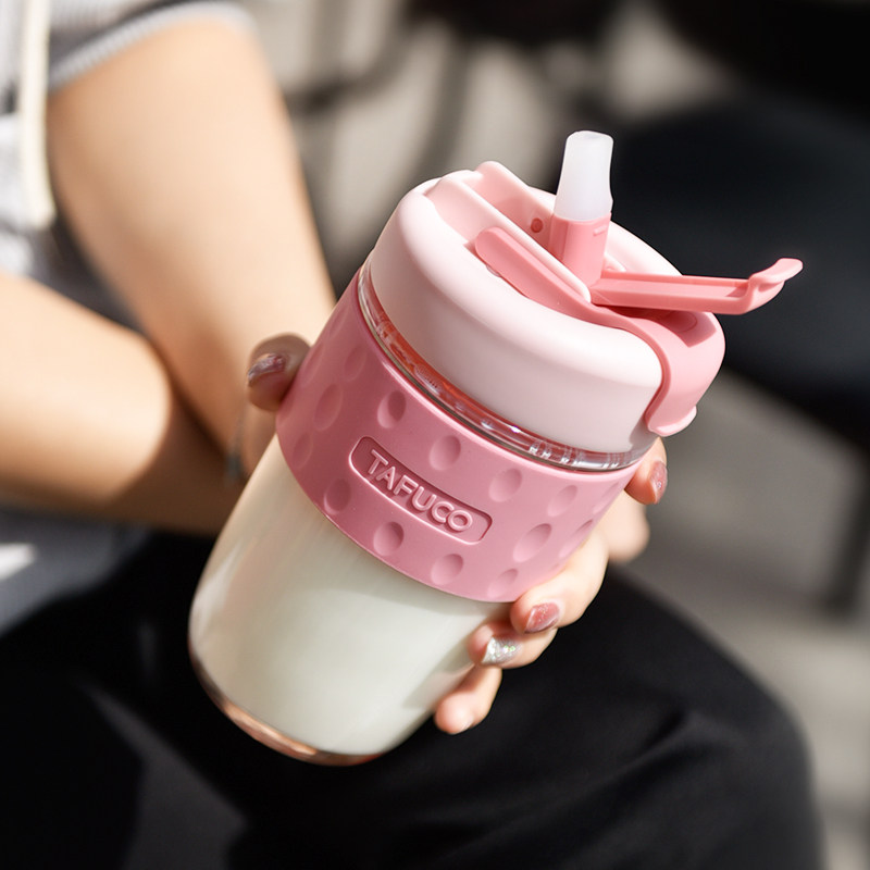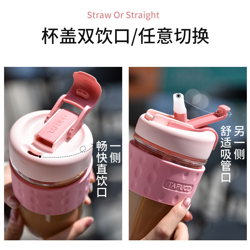 日本泰福高玻璃水杯便携咖啡杯女夏季可爱带吸管杯大容量泡茶杯子