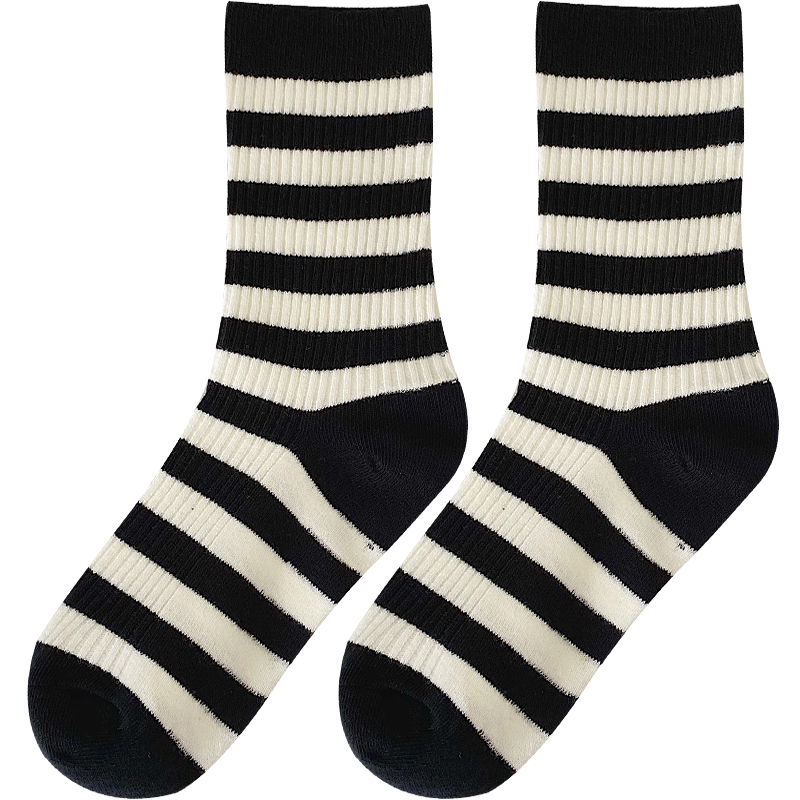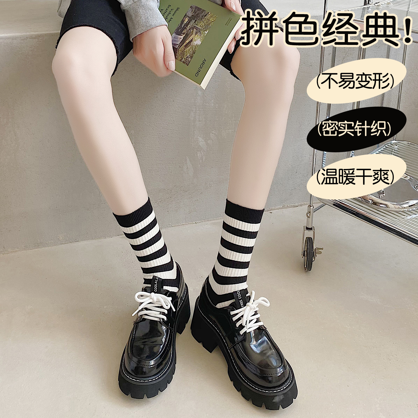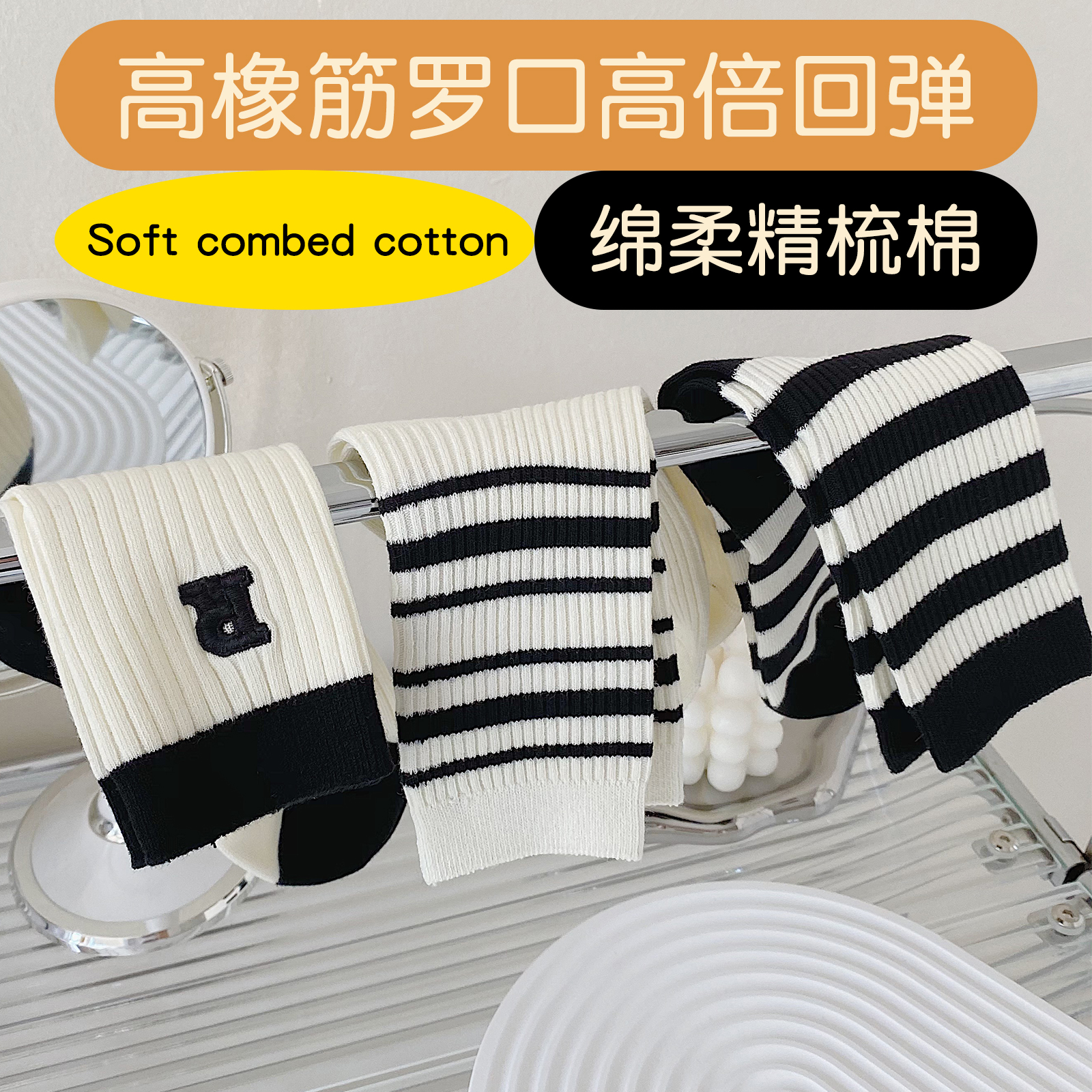 黑白色袜子女纯棉中筒袜2025新款爆款条纹堆堆袜长筒运动袜春秋季