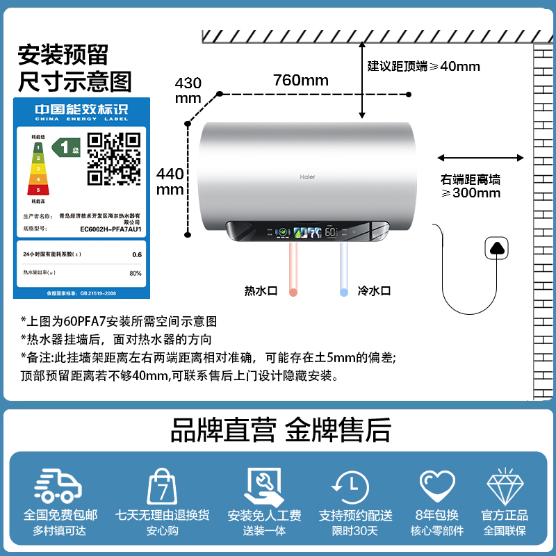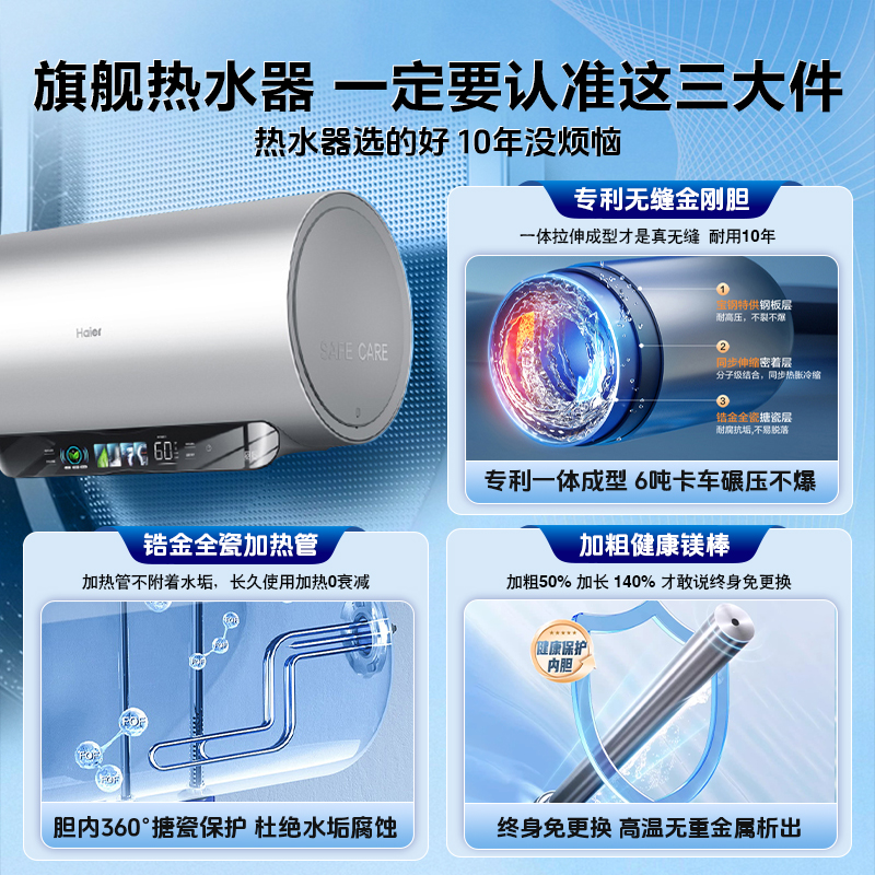 【国补】海尔电热水器洗澡家用速热60L80升一级能效变频免清洗FA7
