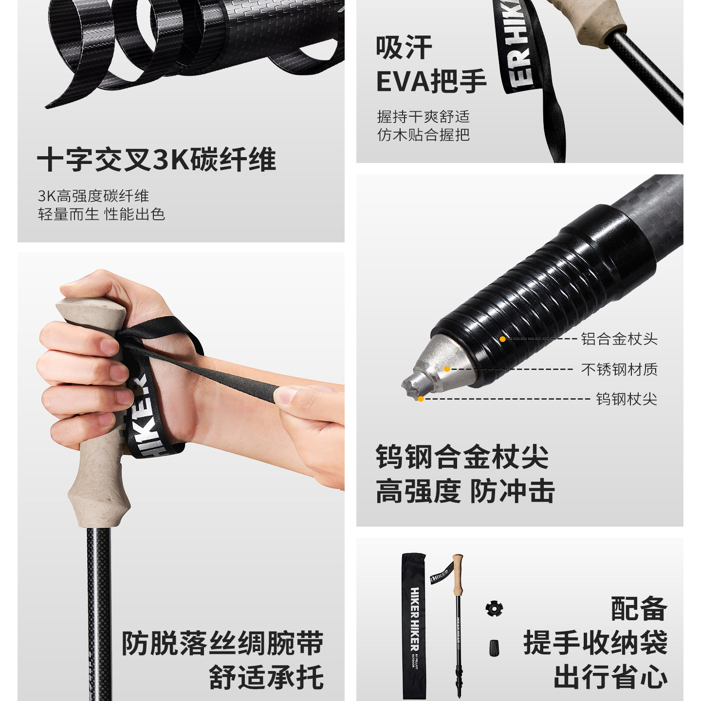 【登峰】伯希和户外登山杖3k碳纤维伸缩防滑拐杖专业徒步爬山手杖