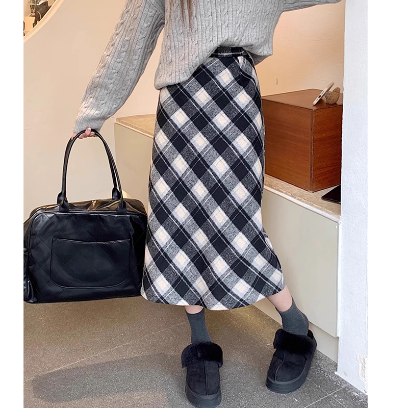 红色毛呢格子半身裙女秋冬大码复古高腰显瘦包臀a字中长格纹裙子