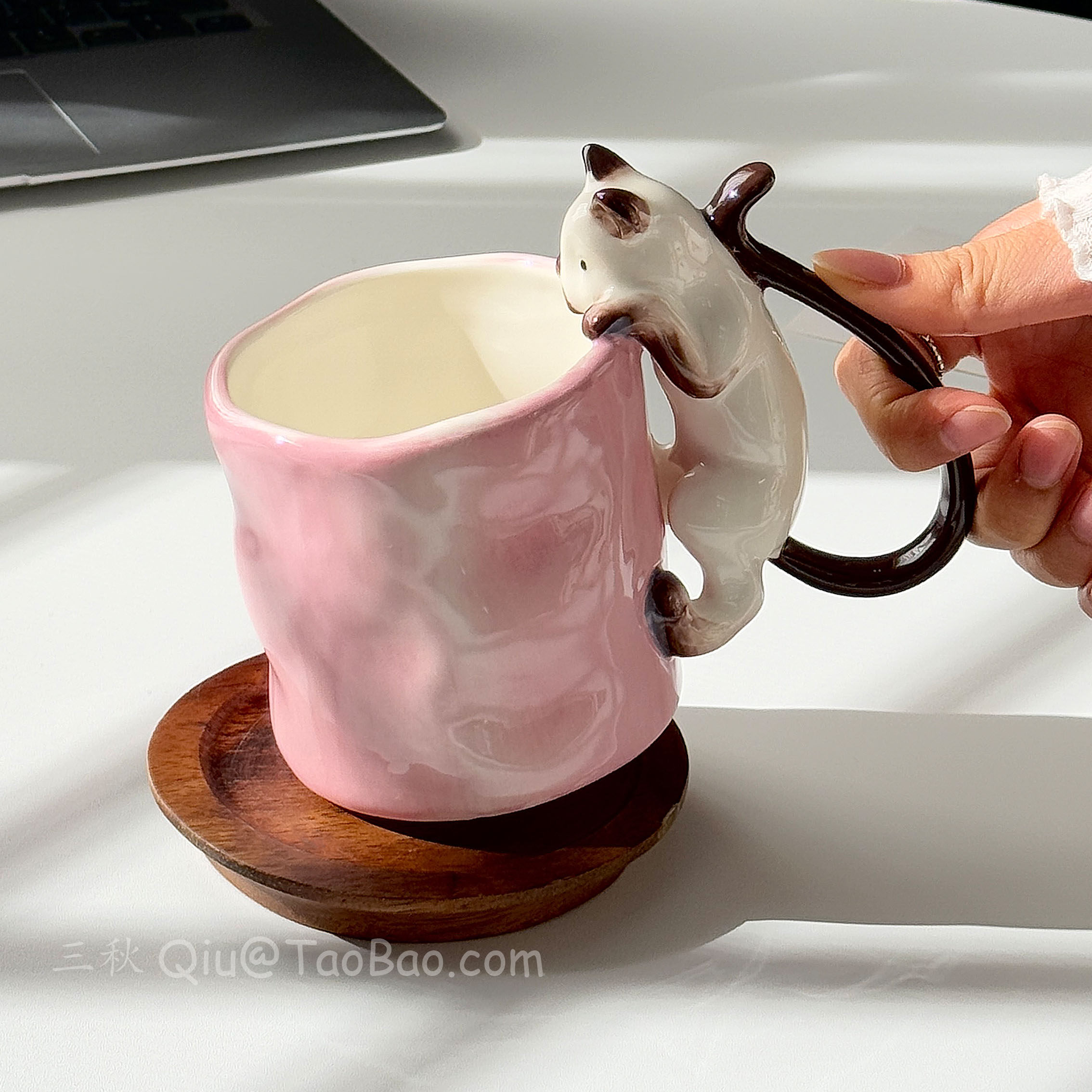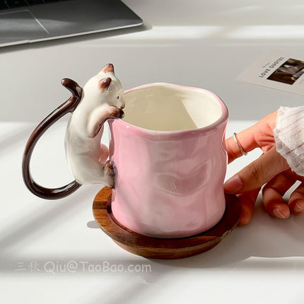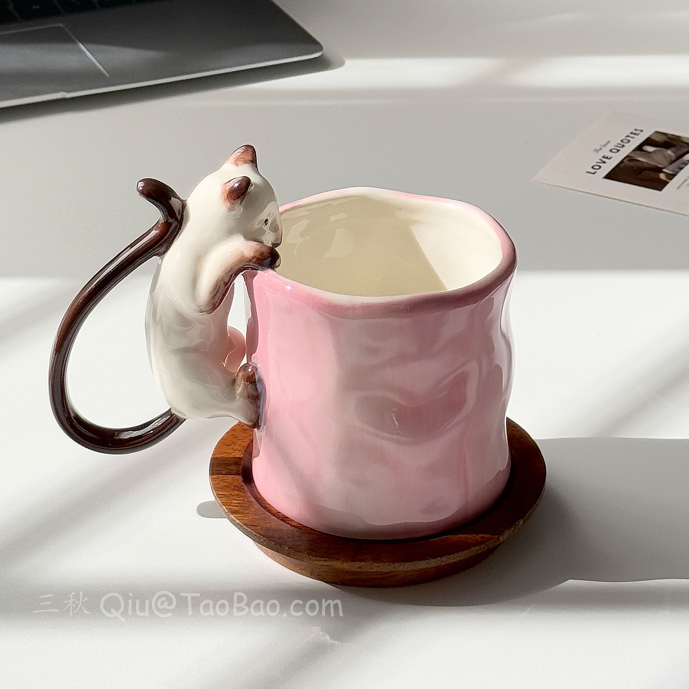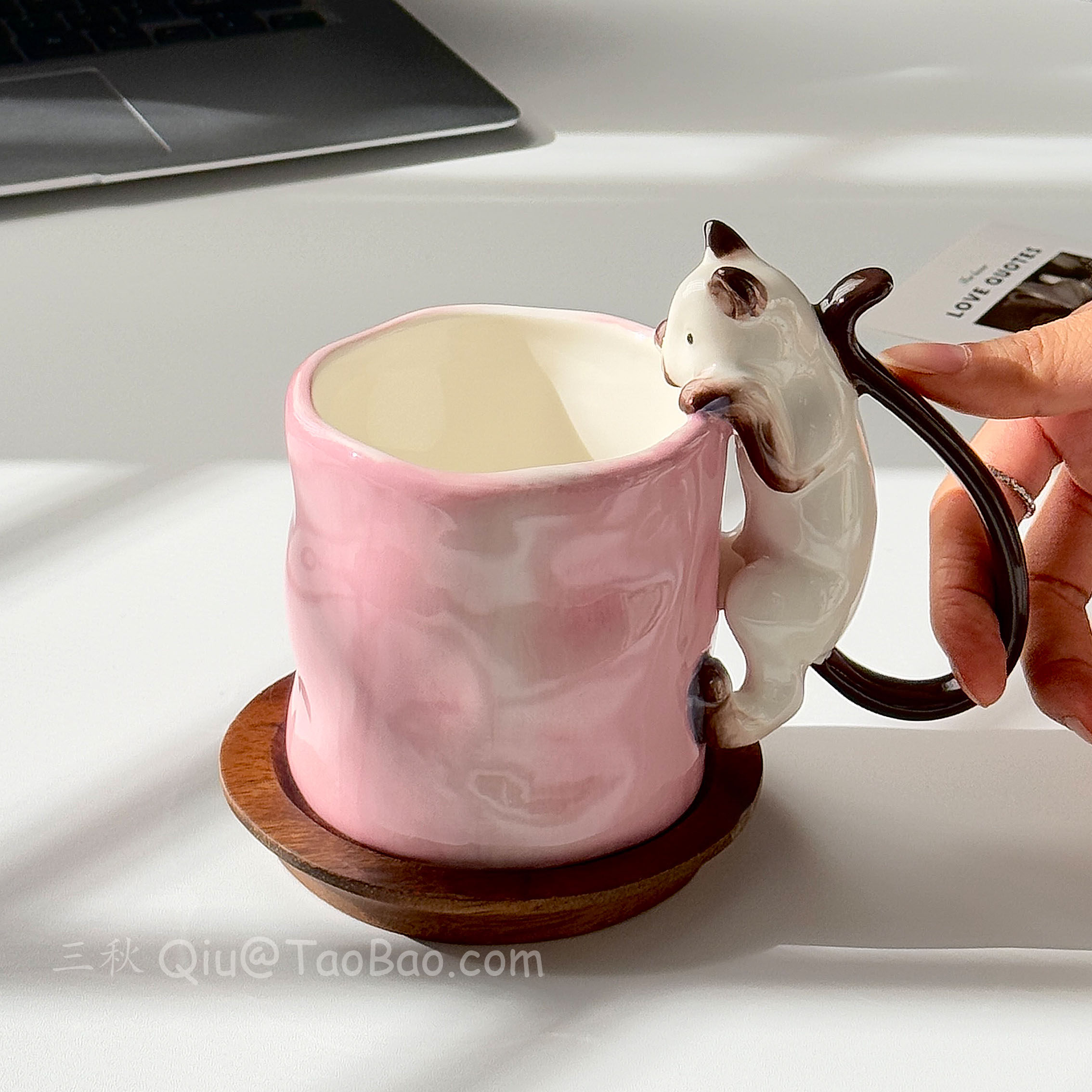 复古手作立体暹罗猫渐变粉马克杯陶瓷杯大容量水杯咖啡杯小众礼物