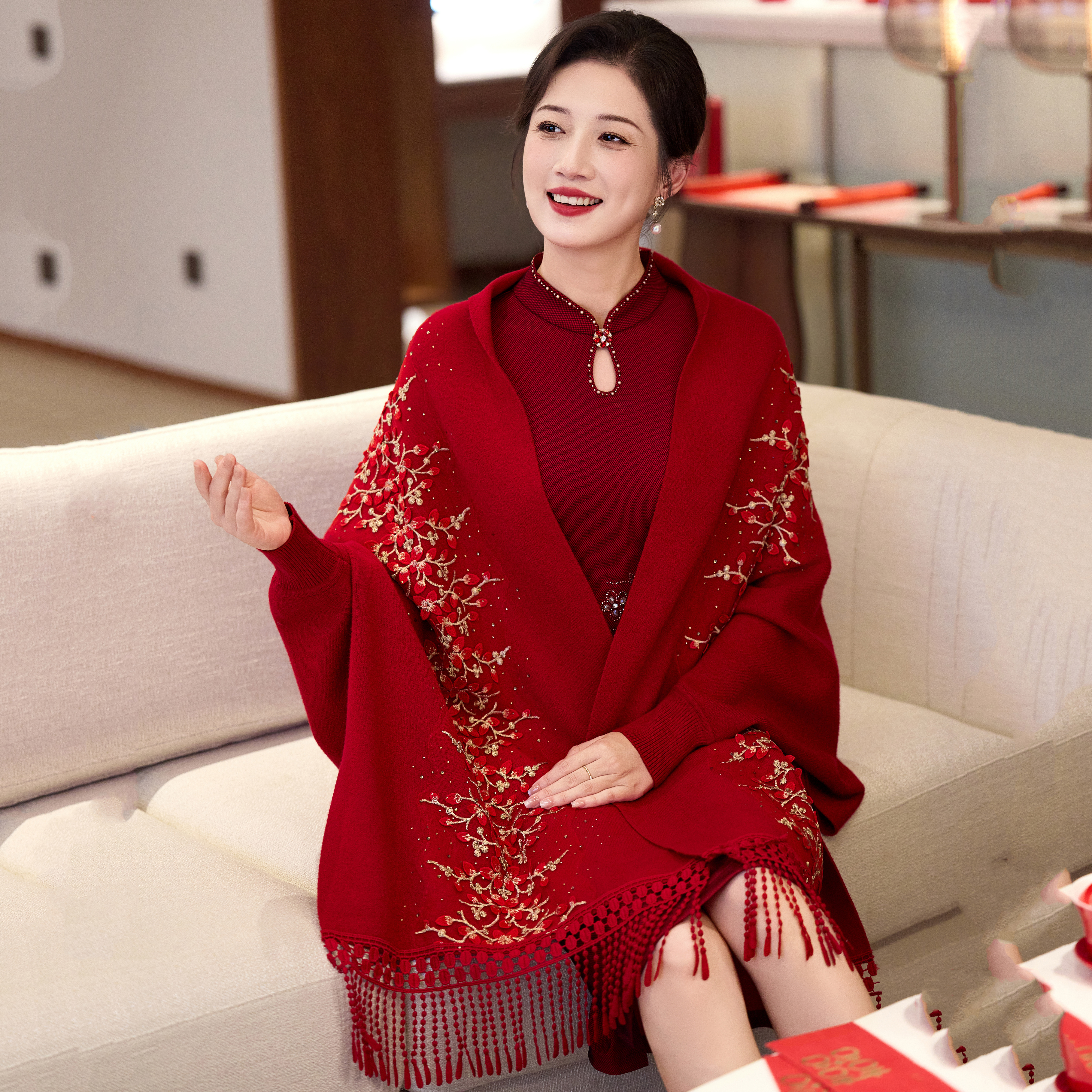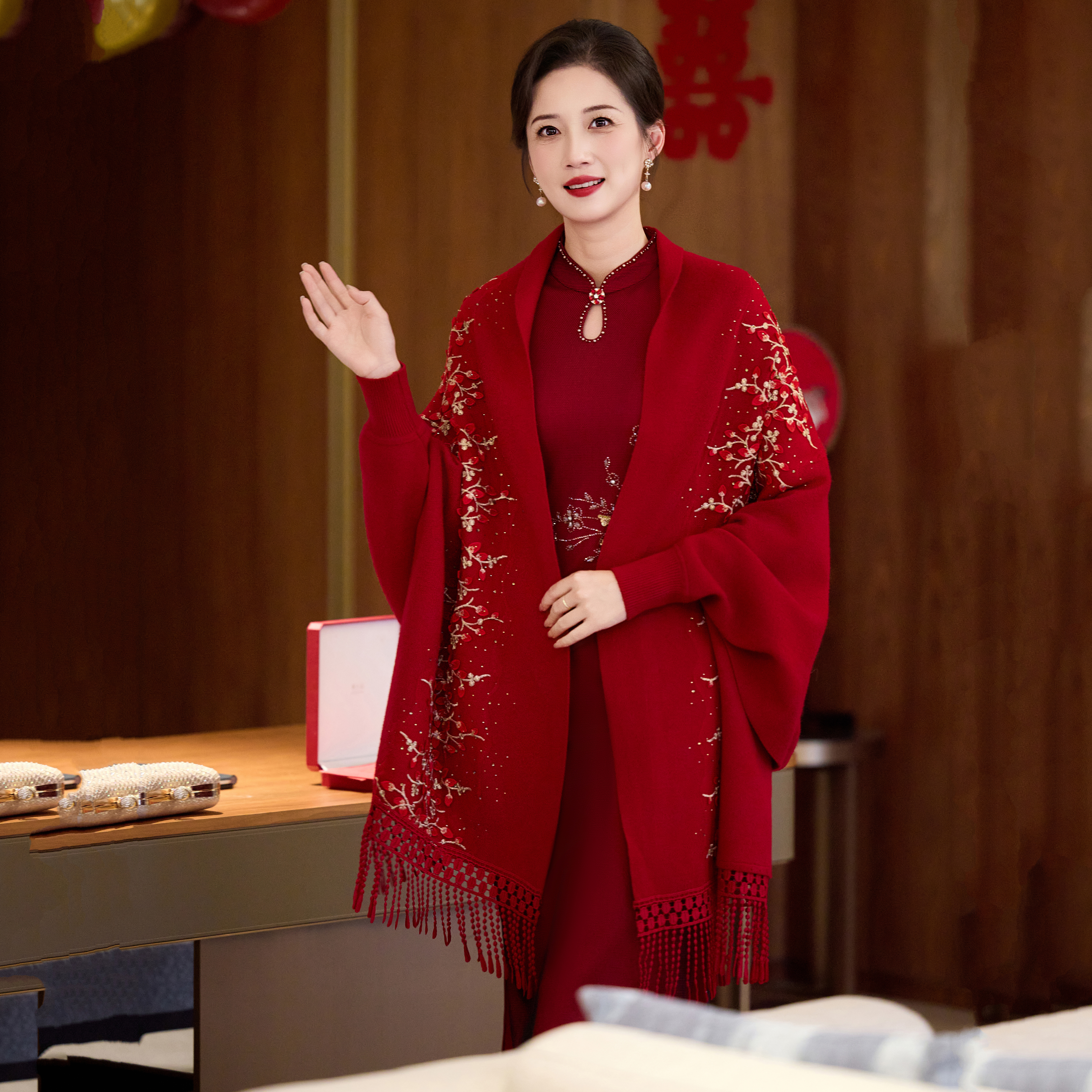 婚宴披肩婚礼红色妈妈秋冬新款高端带袖礼服旗袍婆婆披风斗篷外套