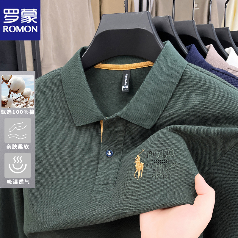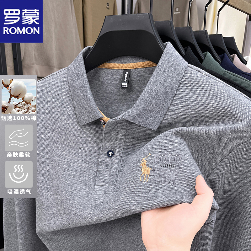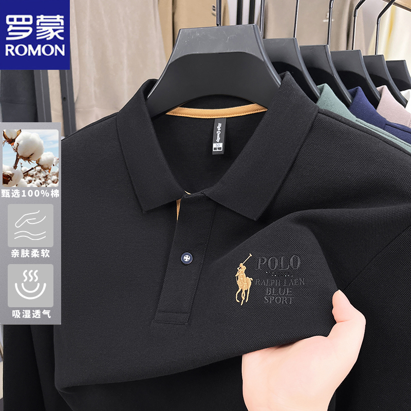 罗蒙春秋季长袖t恤男士纯棉Polo衫刺绣翻领休闲中年上衣服打底衫