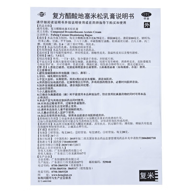 【恒健】复方醋酸地塞米松乳膏10g*1支/盒