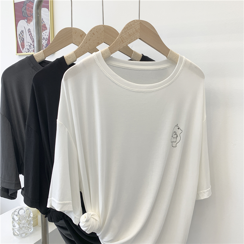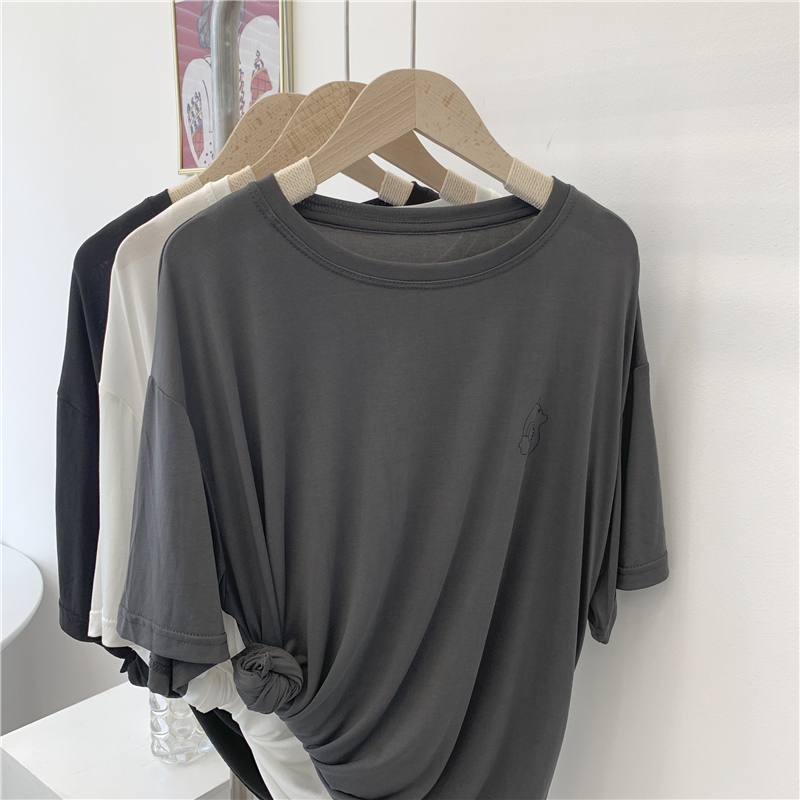 小熊印花铜氨丝短袖白色T恤女简约垂坠感T恤女夏季宽松中长款上衣