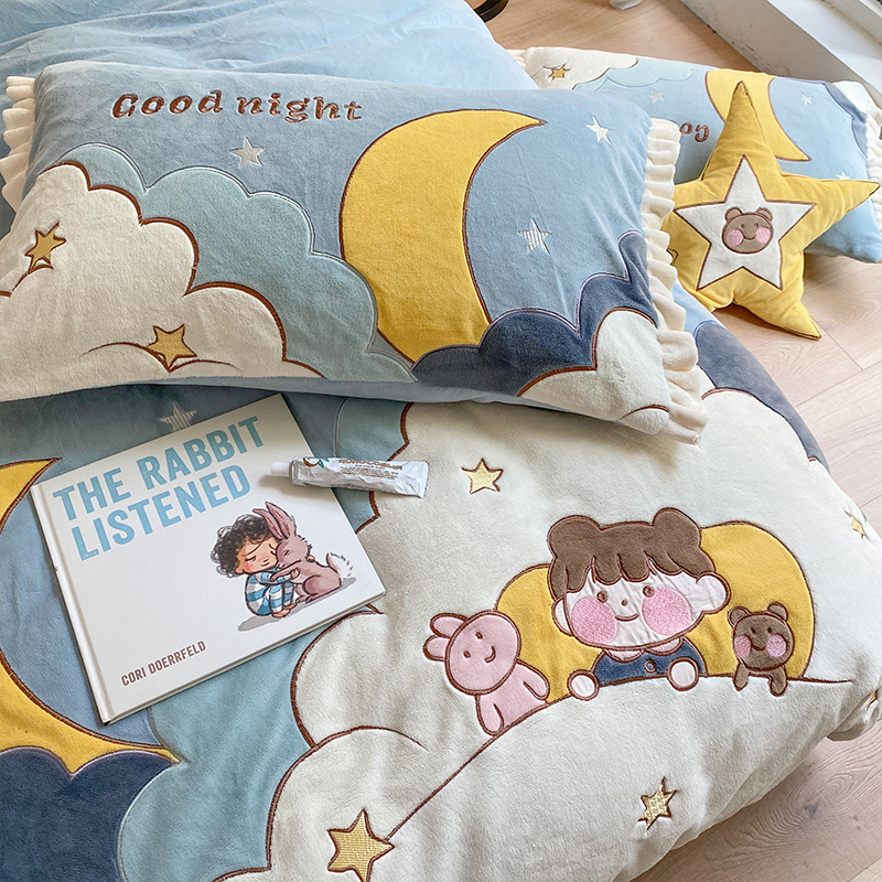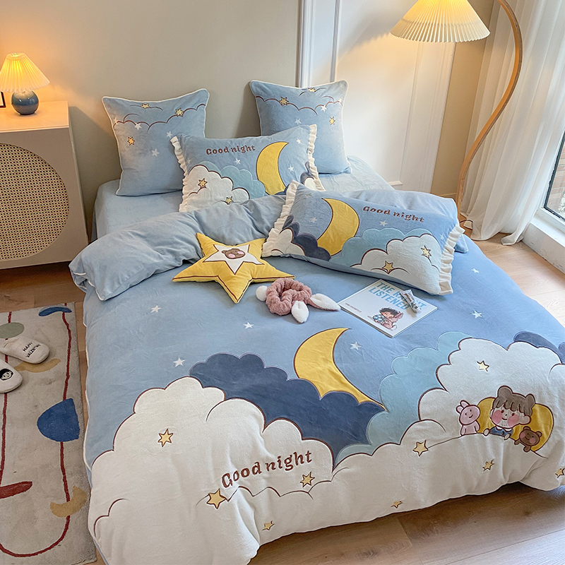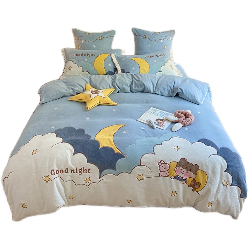 卡通牛奶绒四件套冬季珊瑚绒宝宝绒儿童I可爱云朵被套加绒床上用