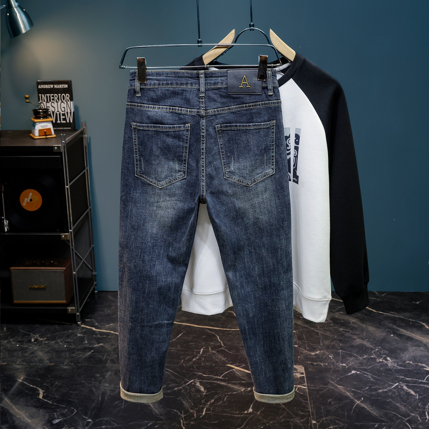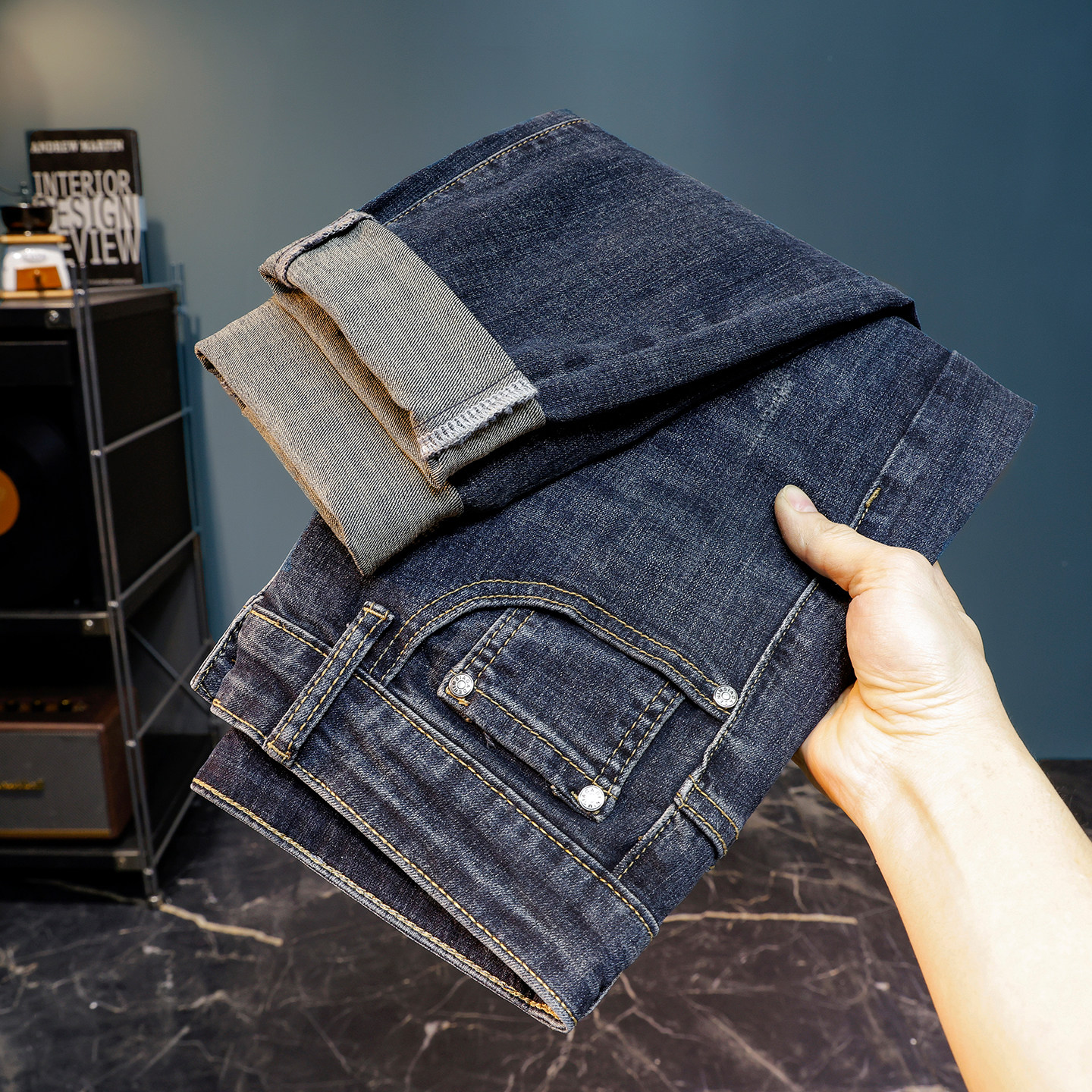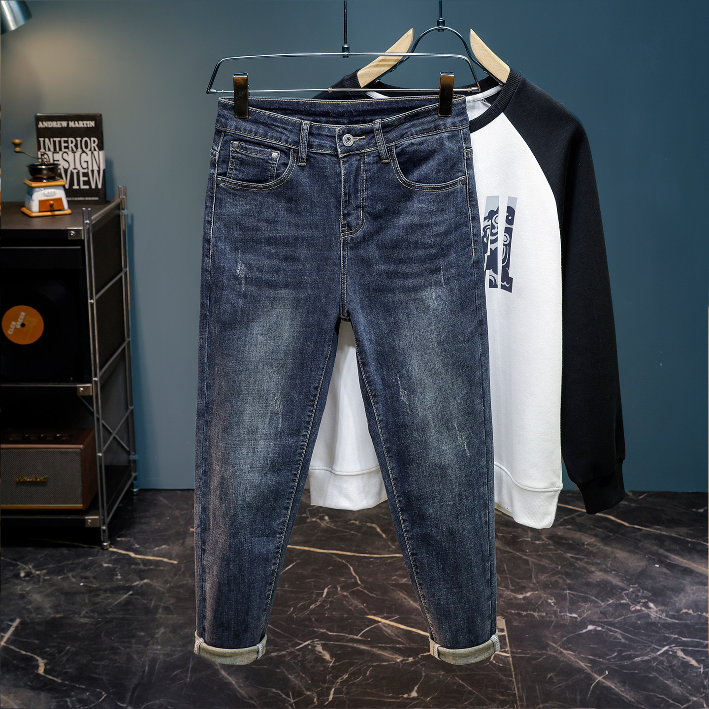 男士加绒牛仔裤蓝灰色修身小脚裤