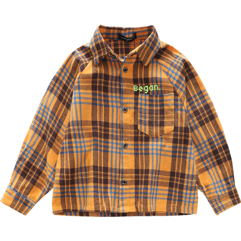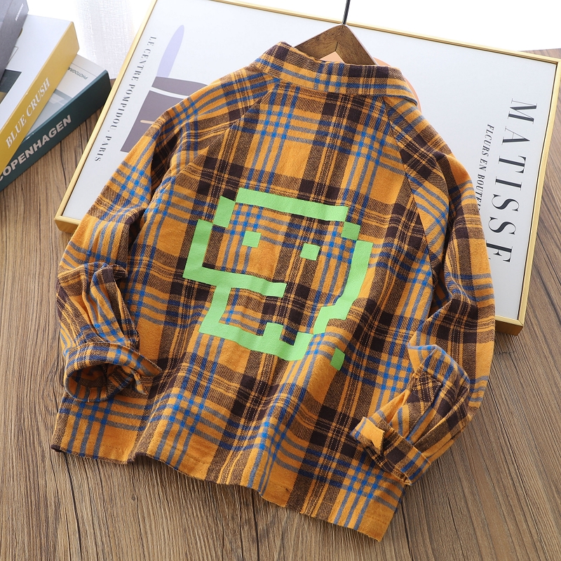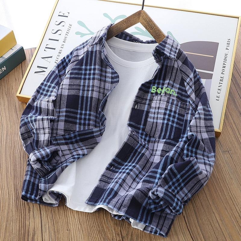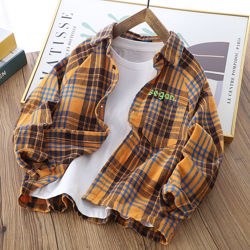 男童春秋格子衬衫2024秋季儿童翻领宽松潮上衣中大童休闲磨毛衬衣