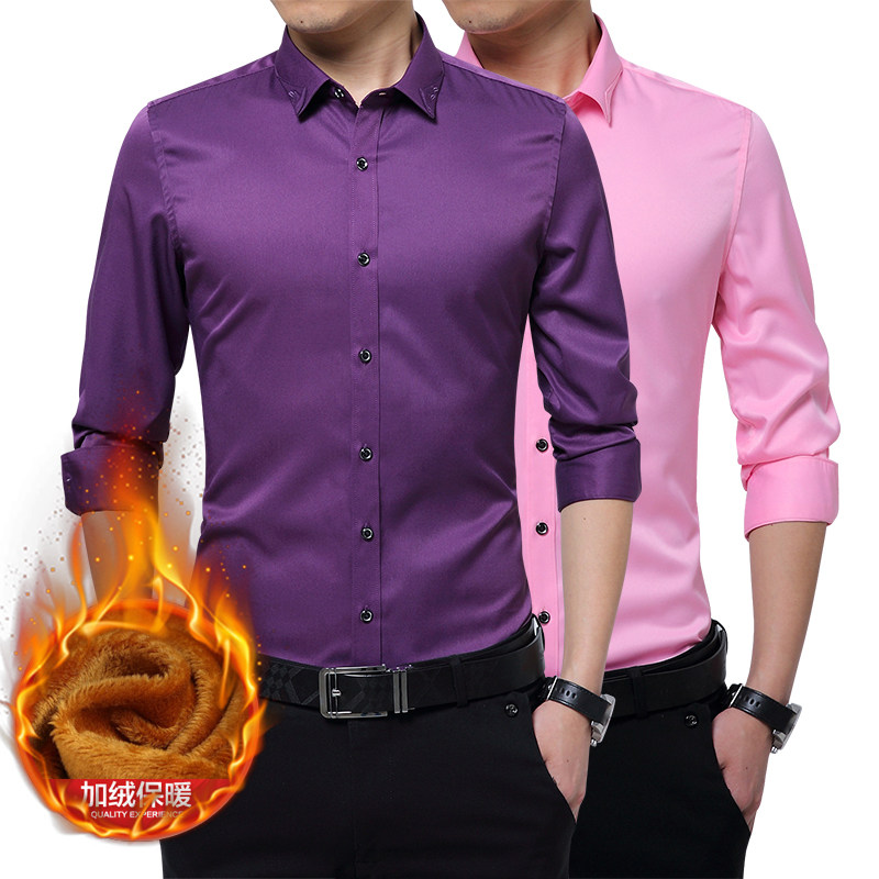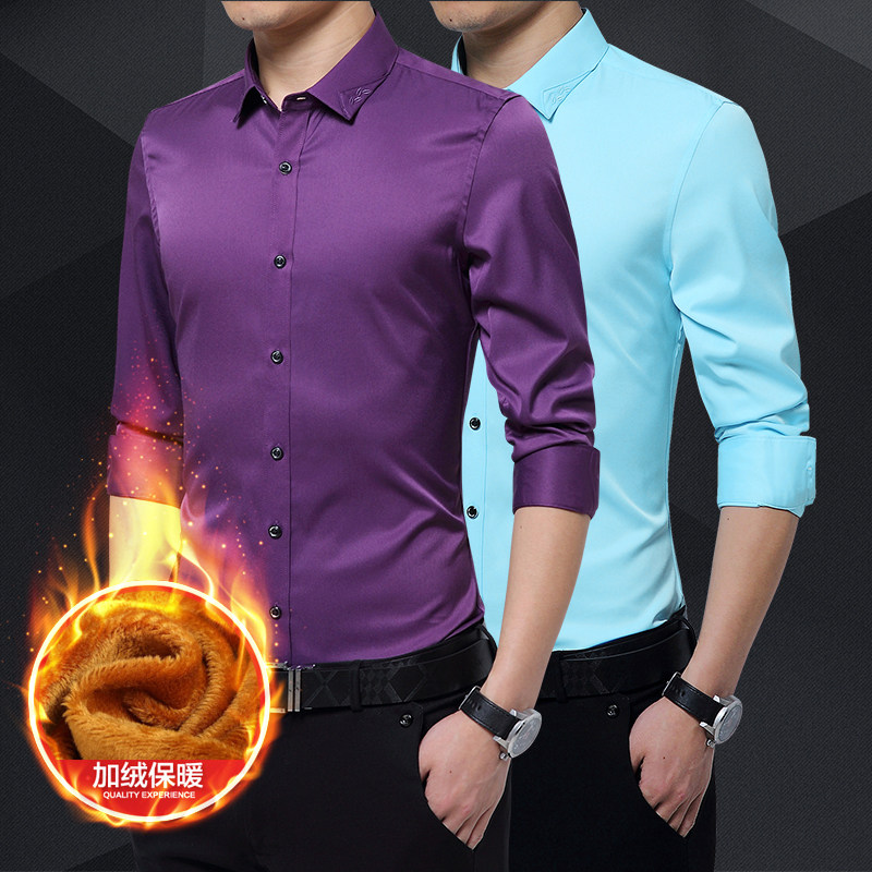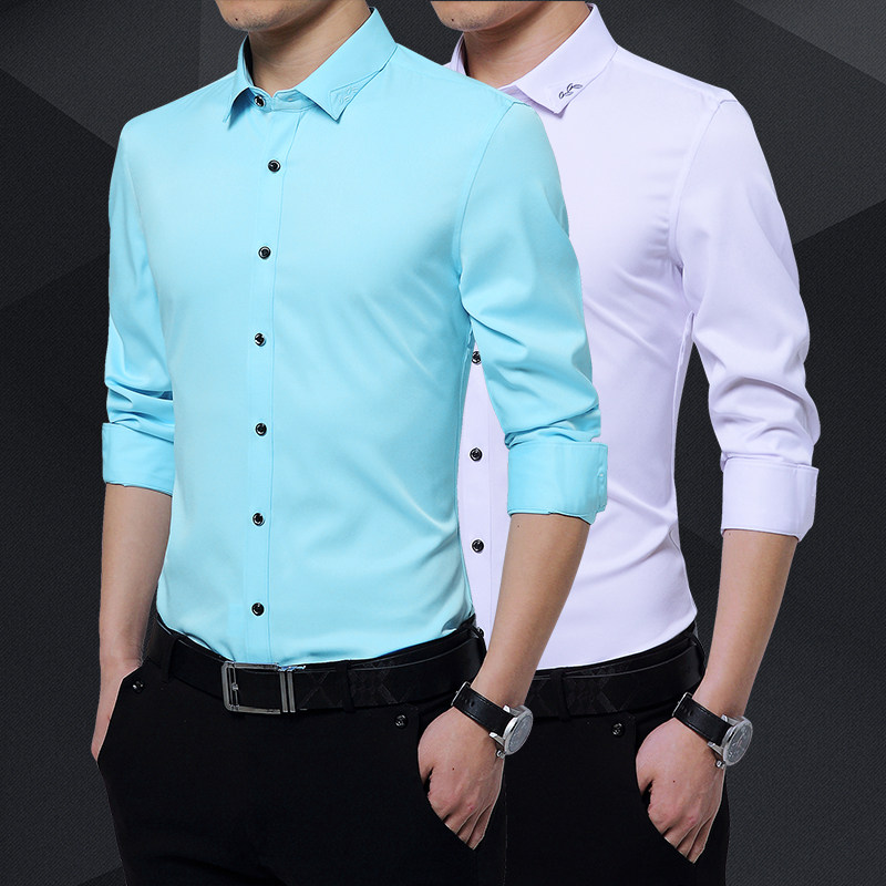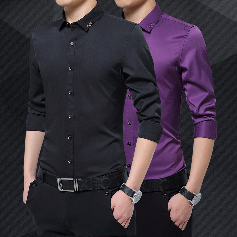 春秋季丝光棉男士长袖衬衫修身韩版商务休闲免烫绣花棉衬衣男薄款