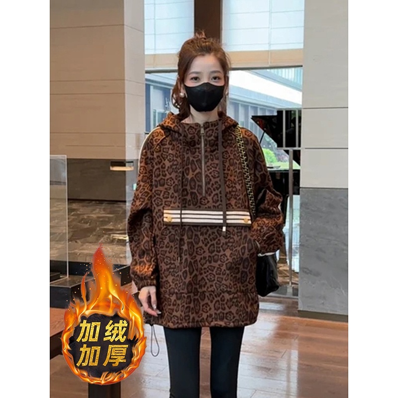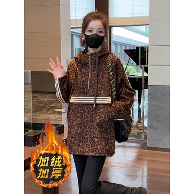 2025早春季新款加绒加厚豹纹连帽卫衣女今年流行的漂亮设计感上衣