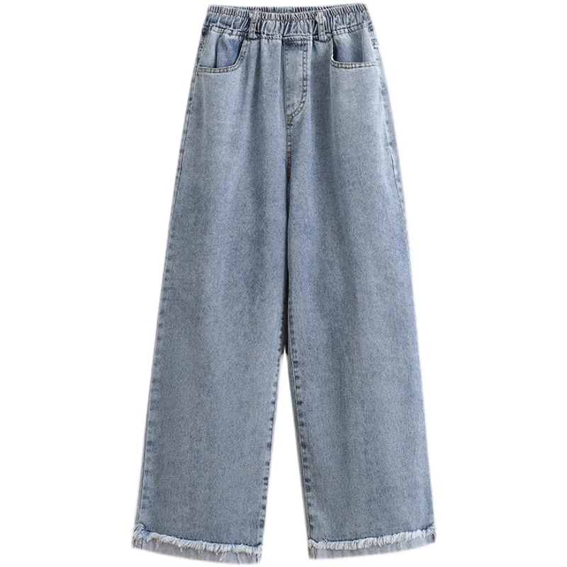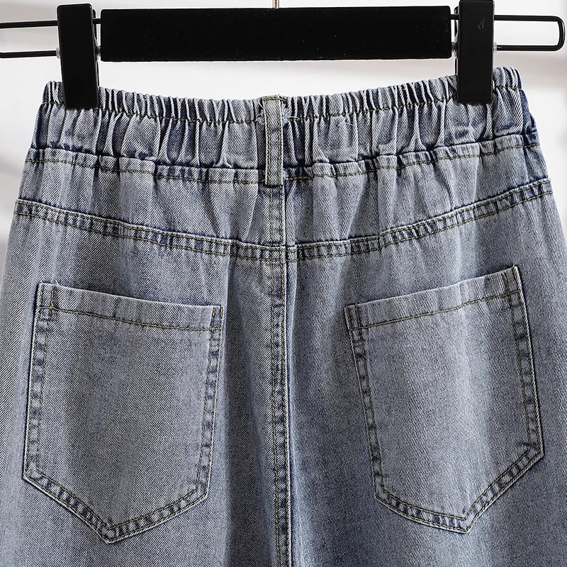 2025年春季新款大码女装胖mm显瘦高腰松紧阔腿直筒卷边牛仔九分裤