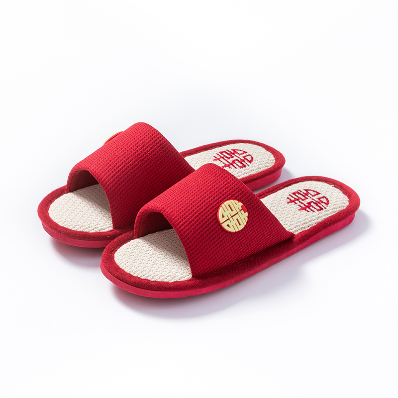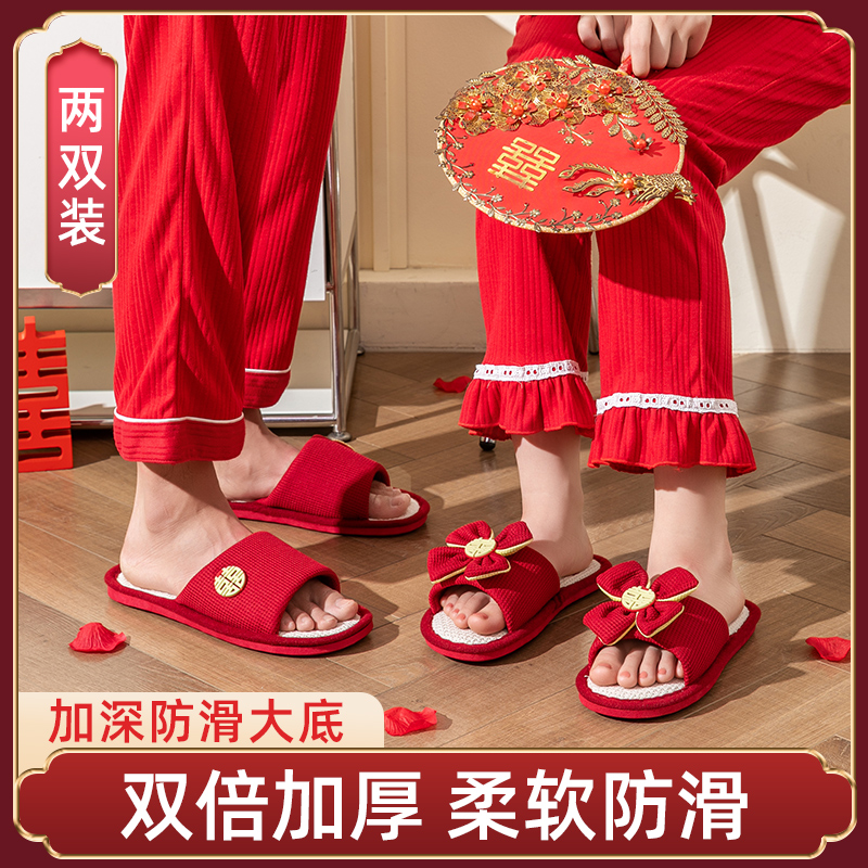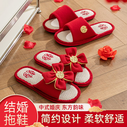 结婚拖鞋新婚情侣亚麻婚庆新郎新娘陪嫁喜庆红色一对夏季高级婚鞋