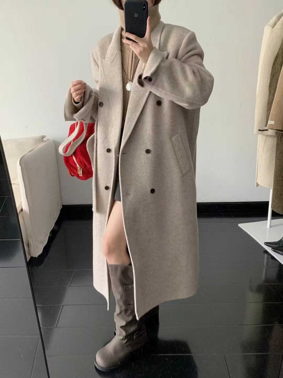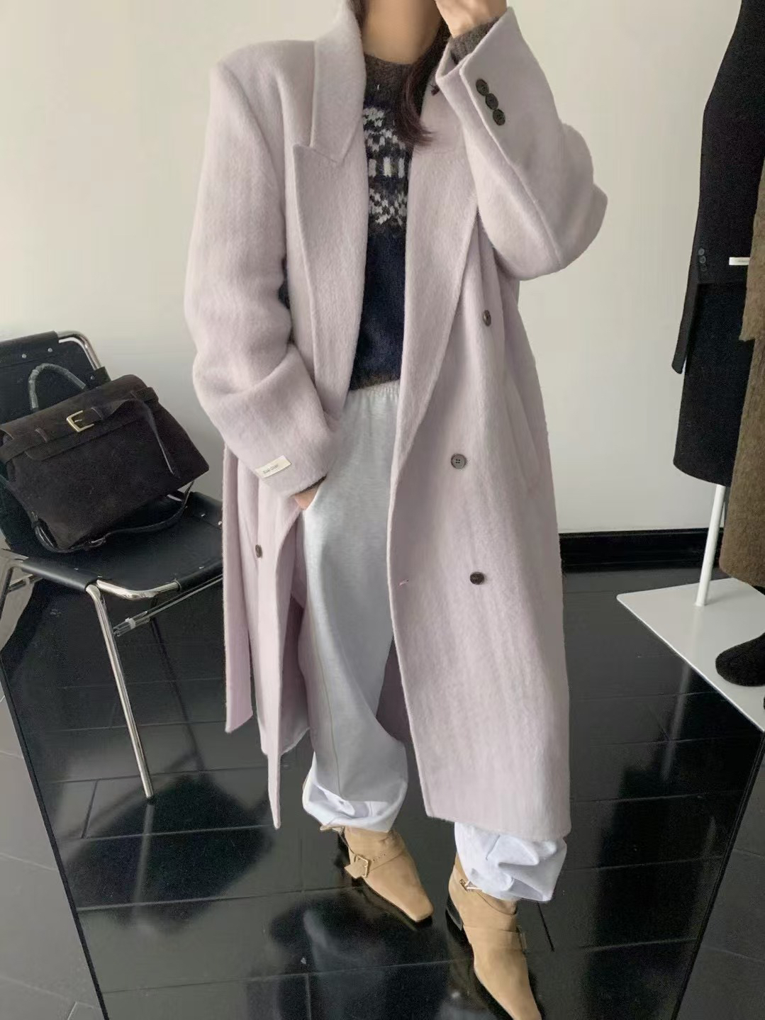 韩国定制新款双面羊绒大衣女中长款过膝韩系西装领紫色羊毛呢外套