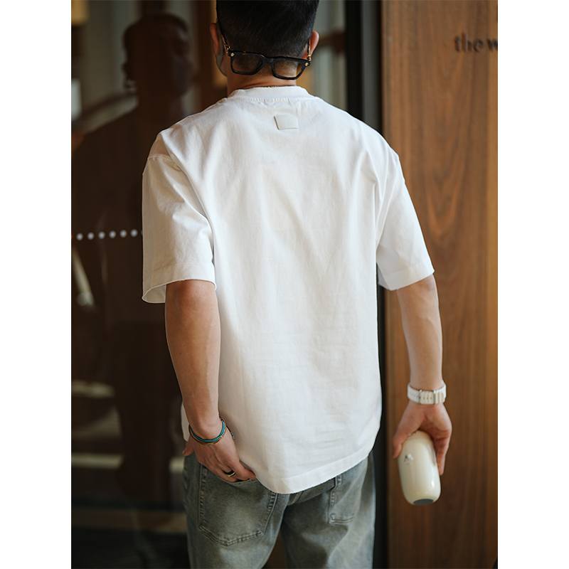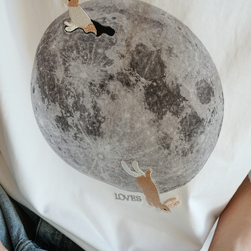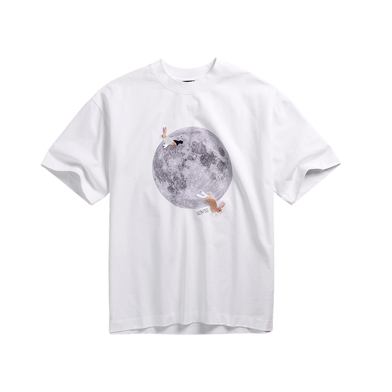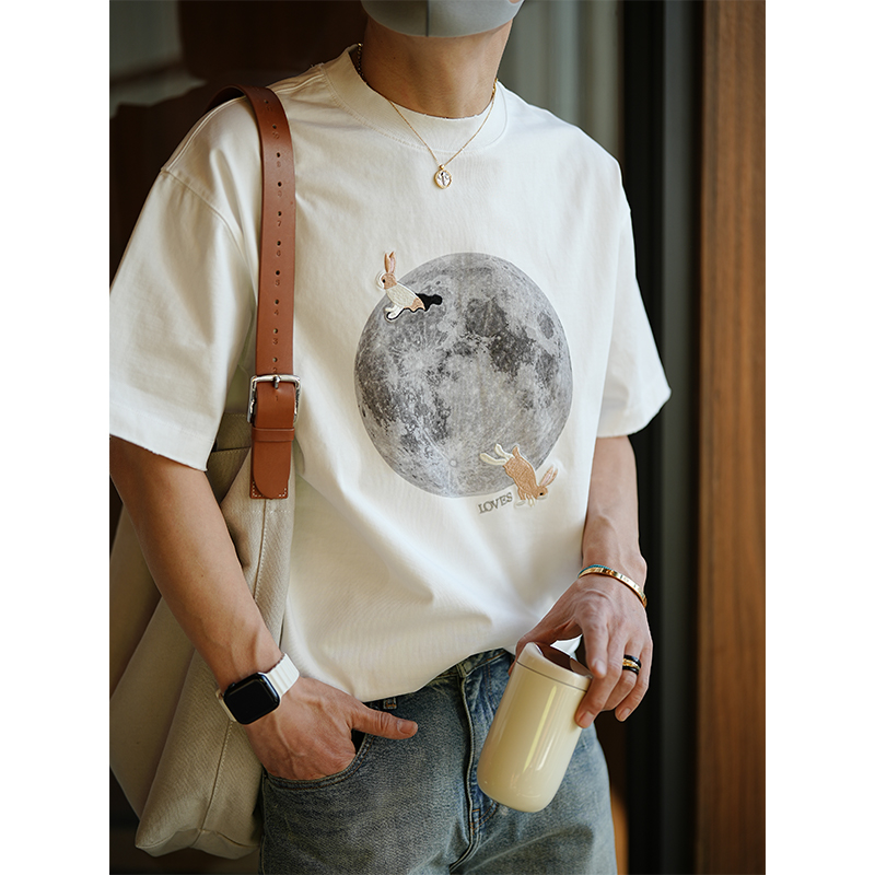 韩系精致小兔刺绣月球喷绘短袖T恤男夏季潮流新款纯棉百搭打底衫
