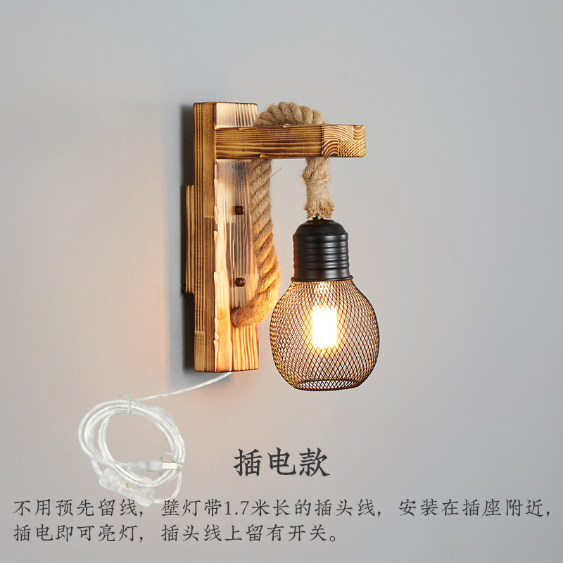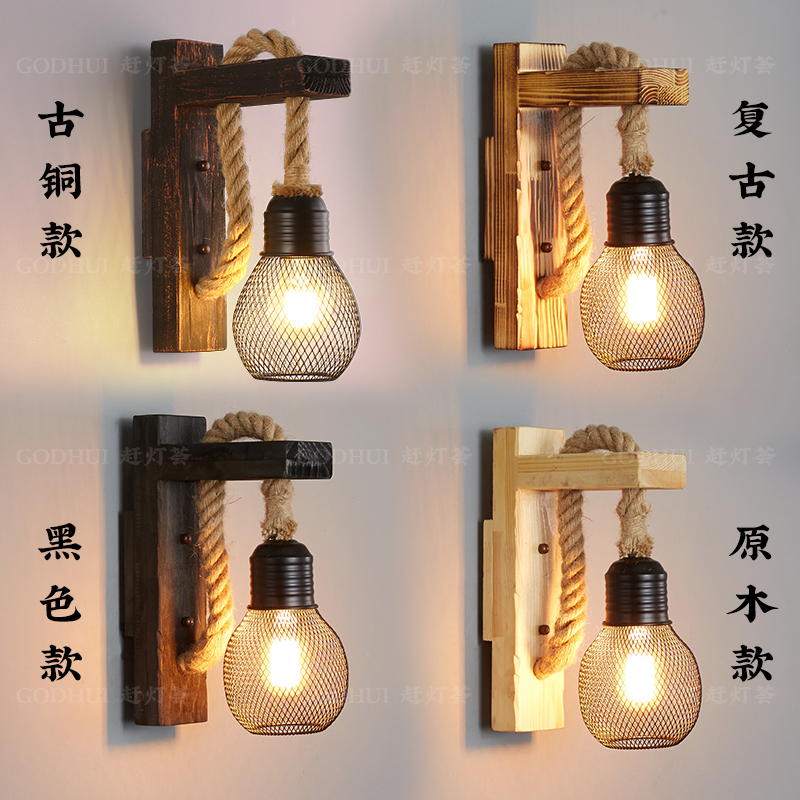 乡村复古实木壁灯餐厅饭馆民宿走廊过道农家乐工业风麻绳墙壁灯具