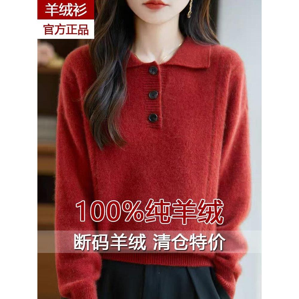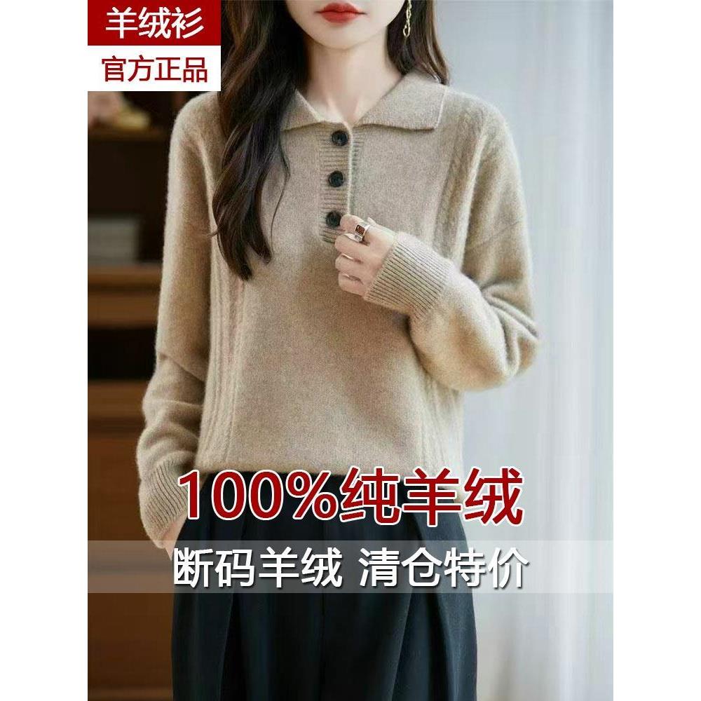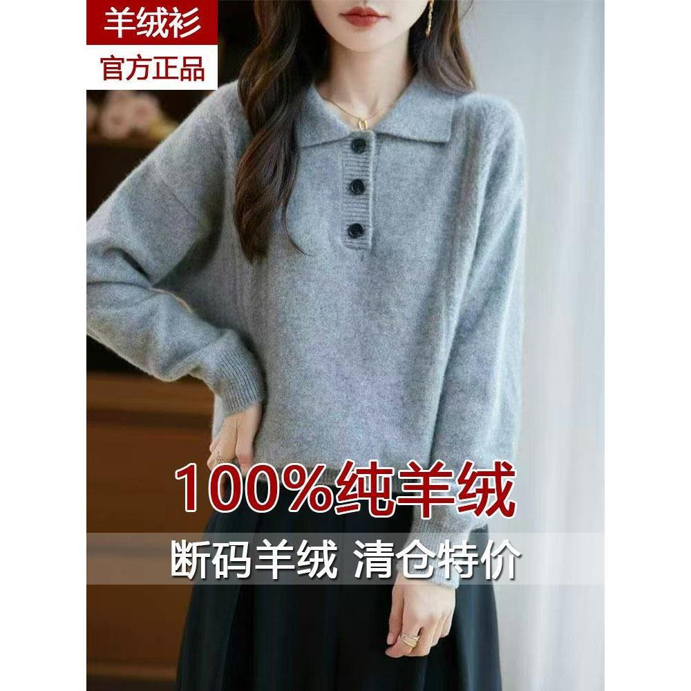 纯山羊绒针织打底衫女士秋冬新款POLO领宽松保暖上衣纯色加厚毛衣