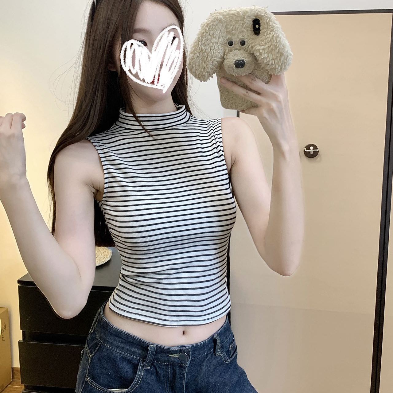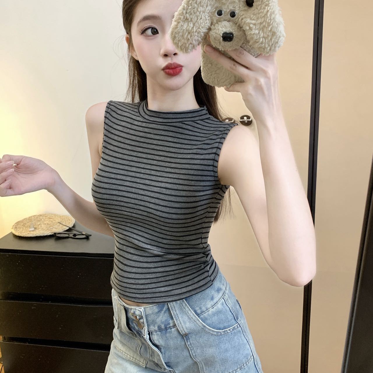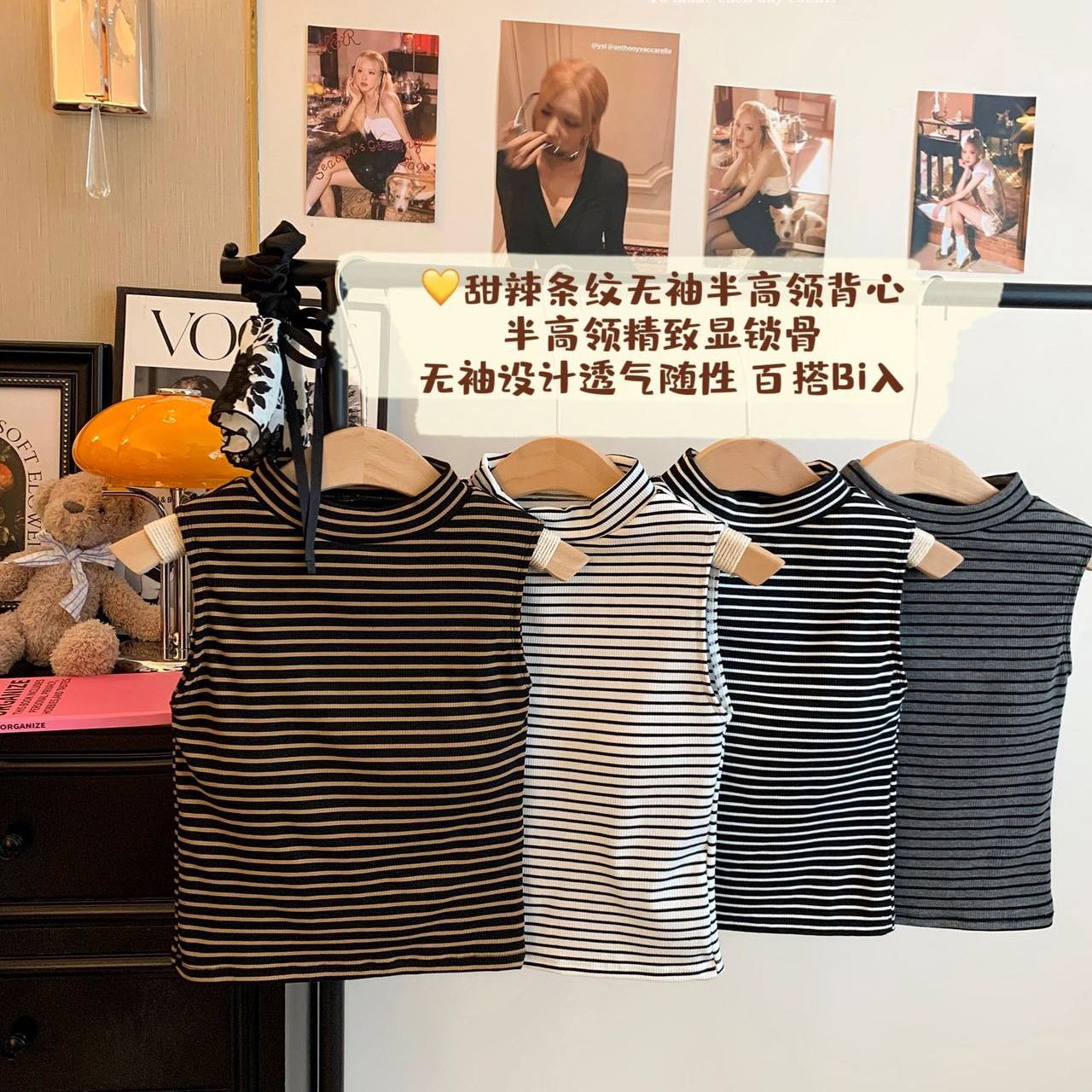 纯欲高领条纹美背吊带背心女外穿带胸垫一体裹胸修身性感内衣抹胸