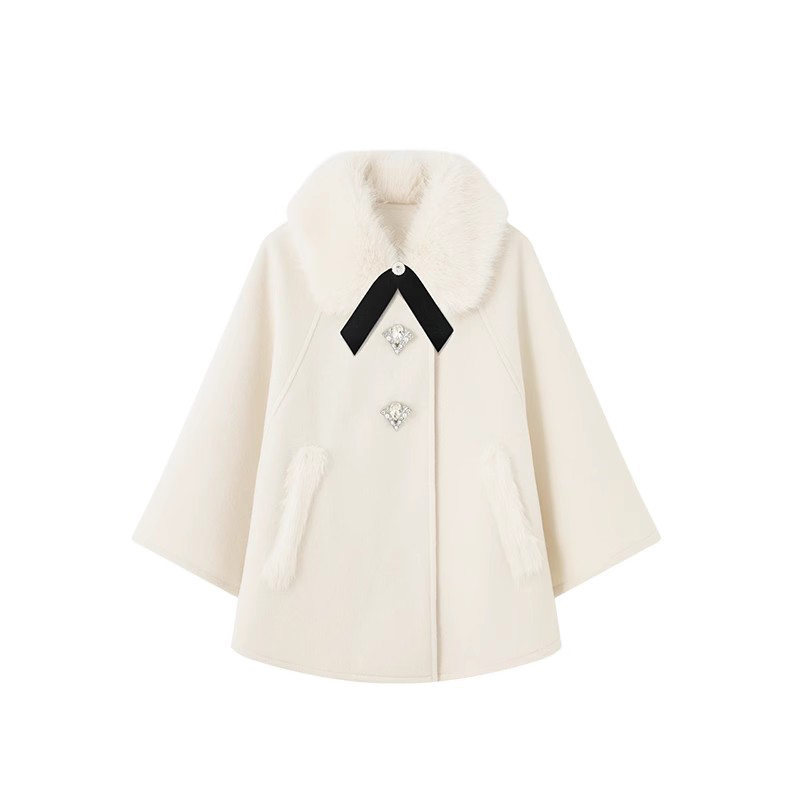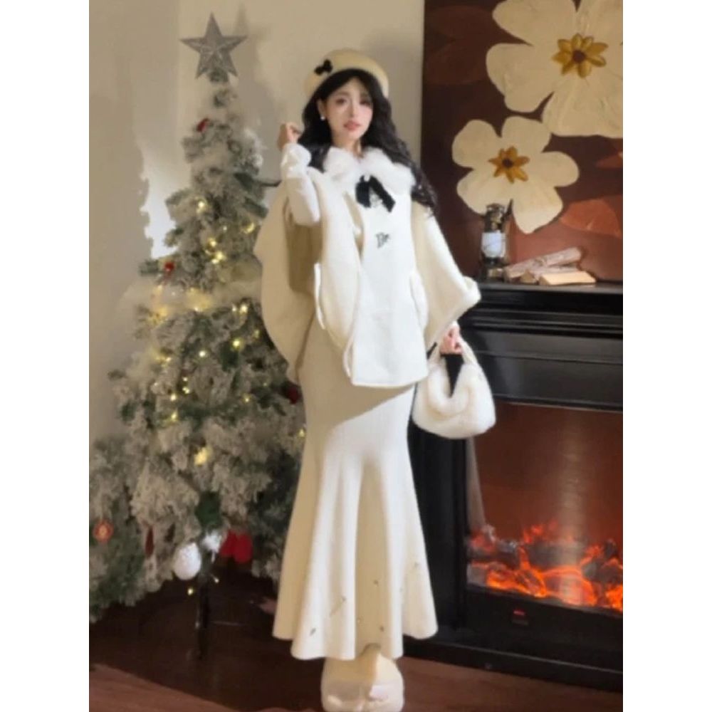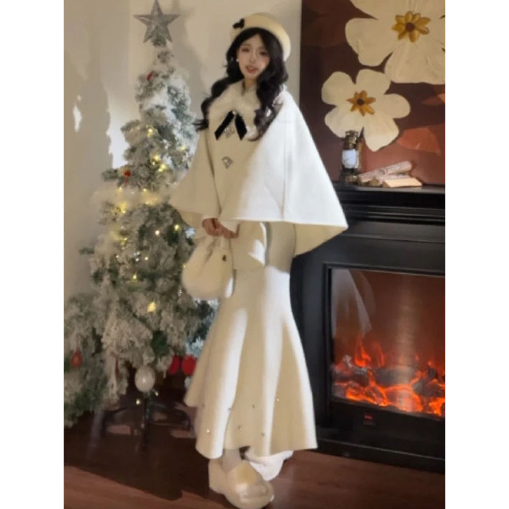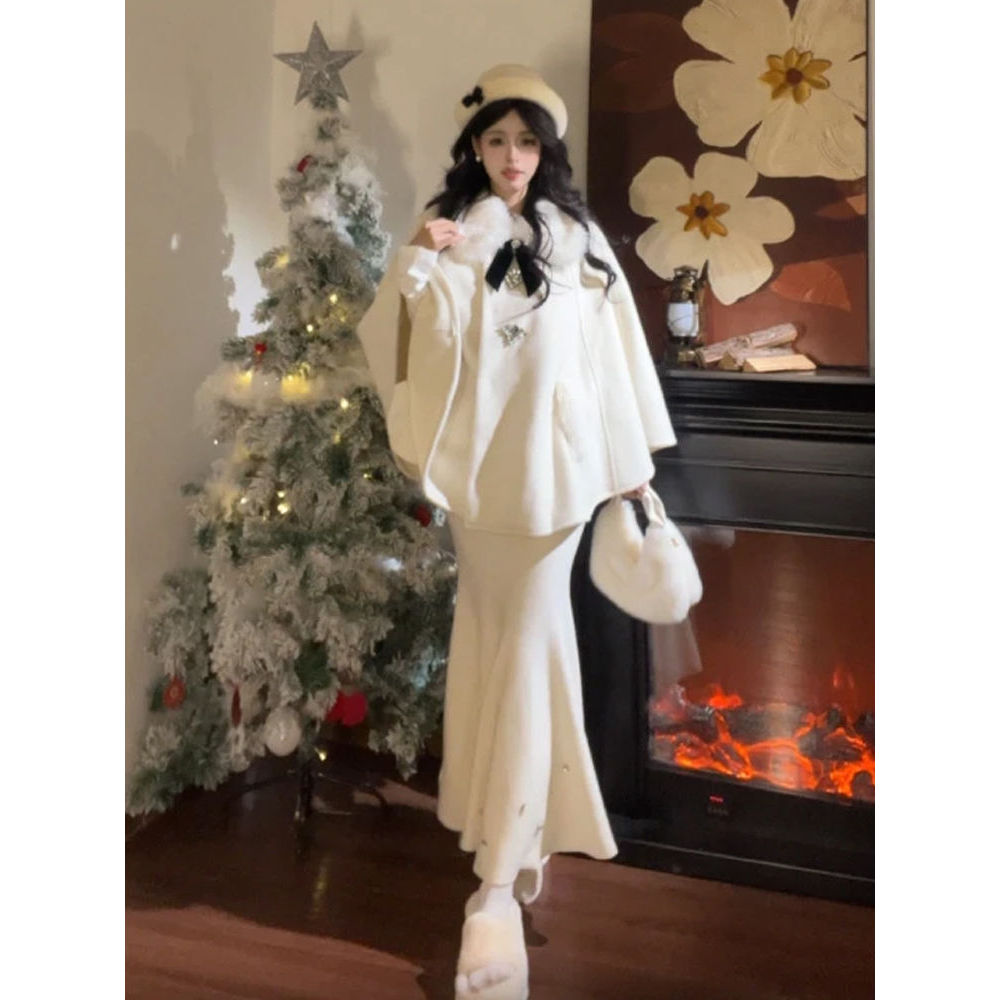 秋冬新款法式千金赫本斗篷毛呢山茶花外套半裙套装