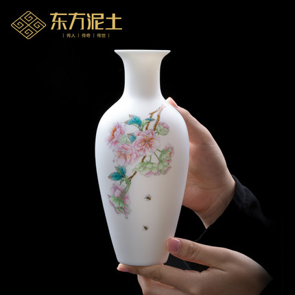 东方泥土《樱雪飘香》庄晓明大师手绘中式陶瓷小花瓶客厅装饰摆件