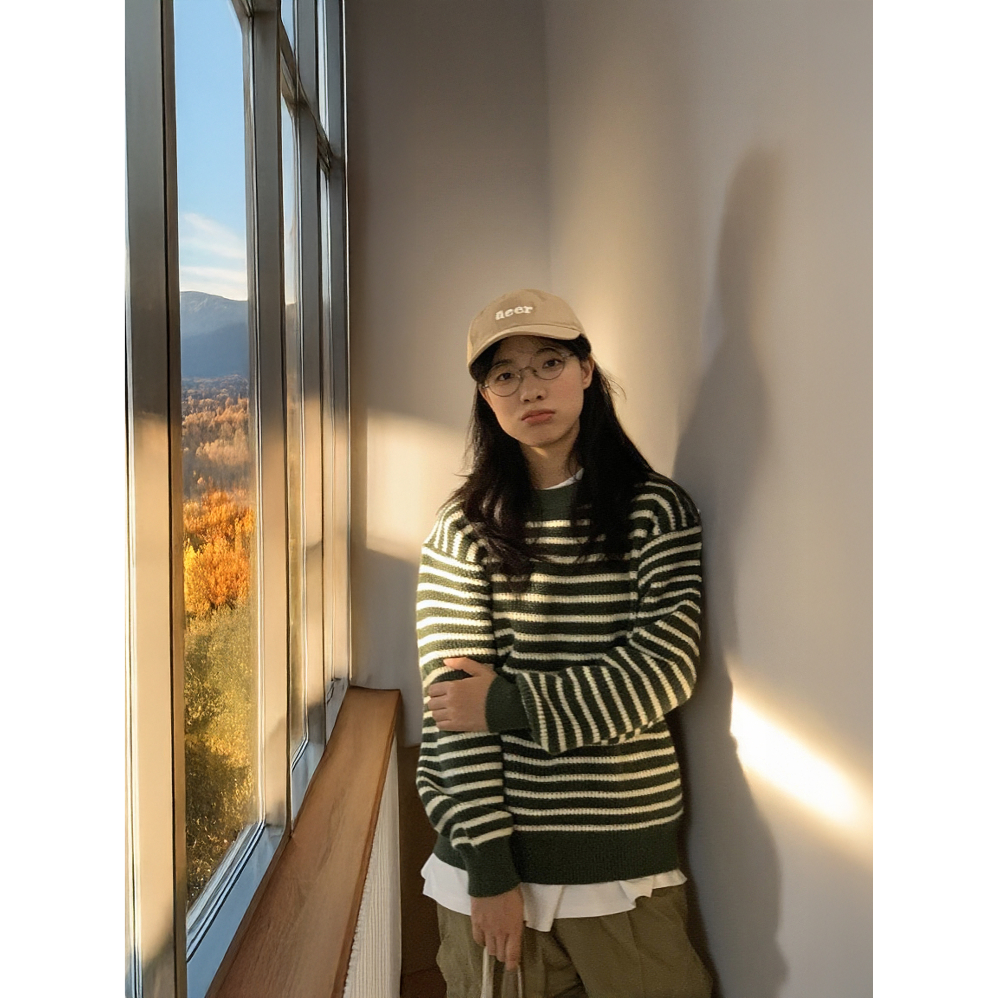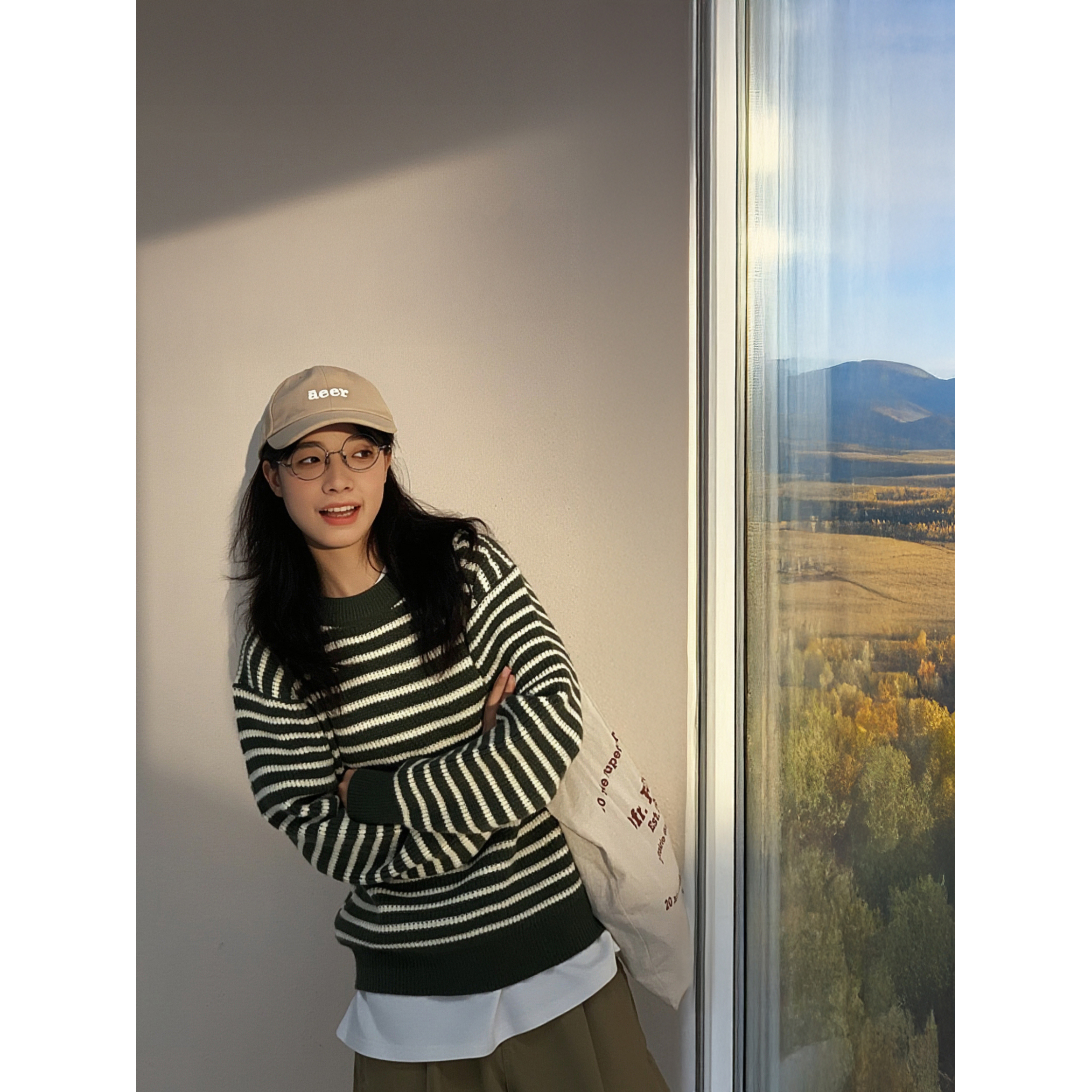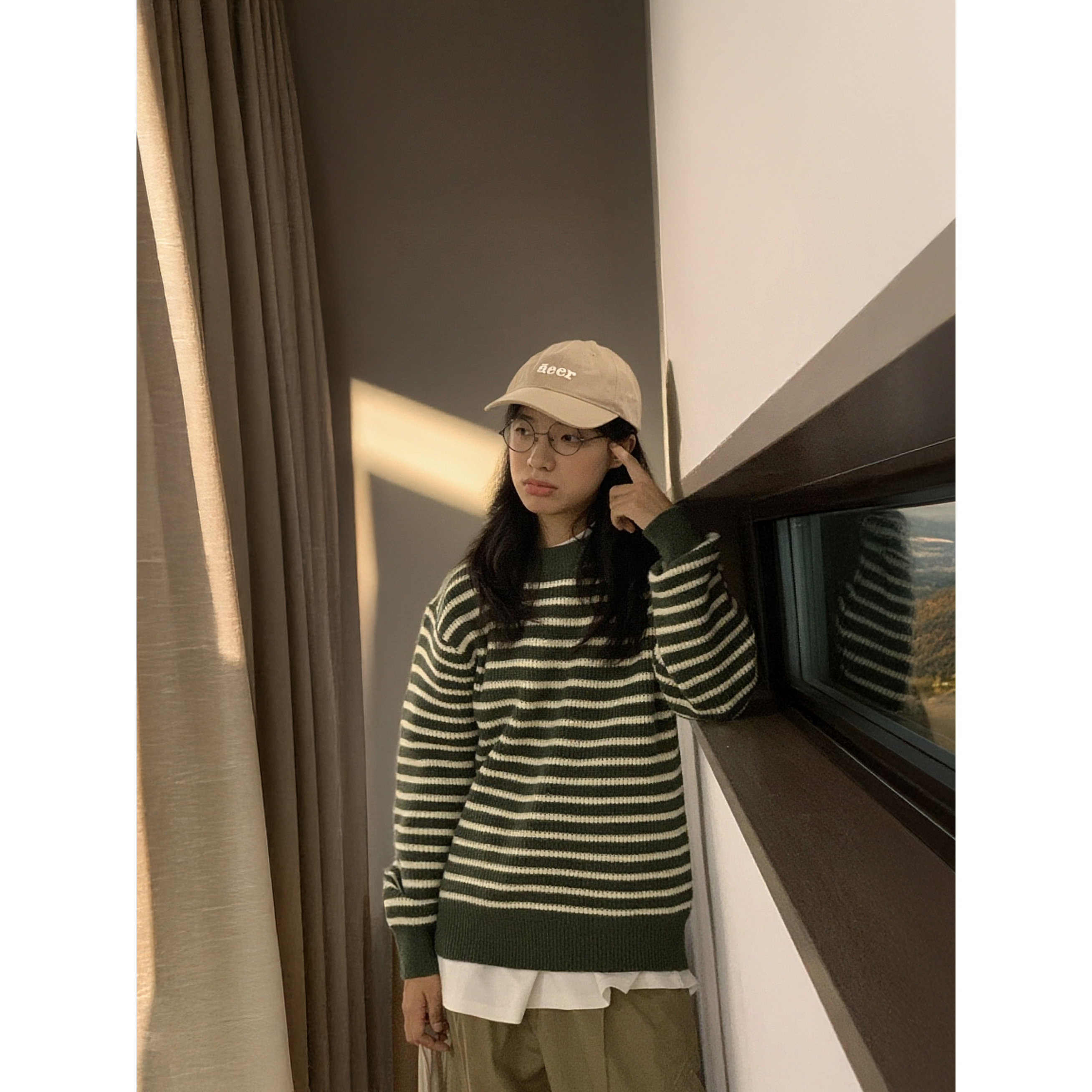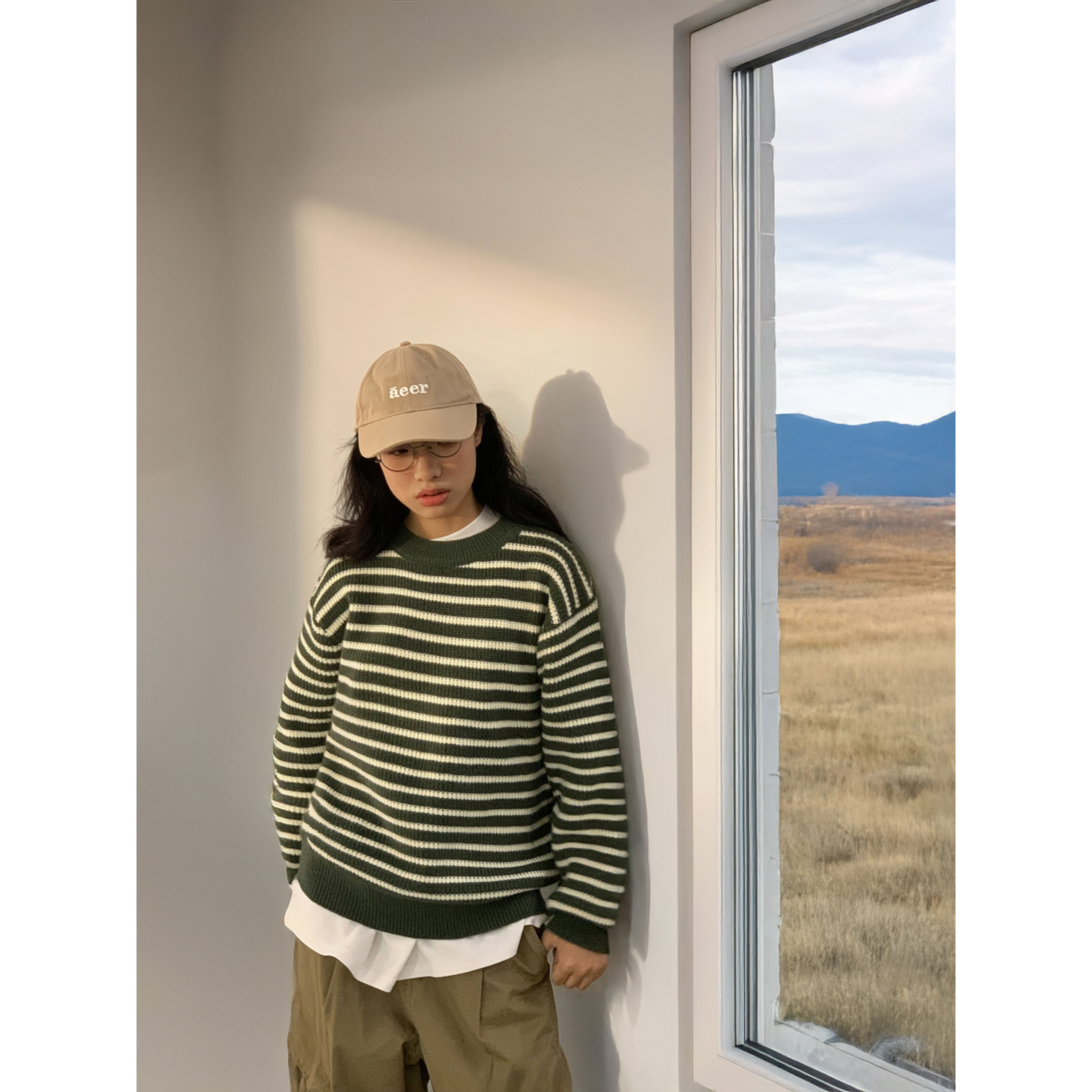 日系绿色条纹毛衣秋冬套头保暖慵懒风针织衫男女打底内搭复古上衣