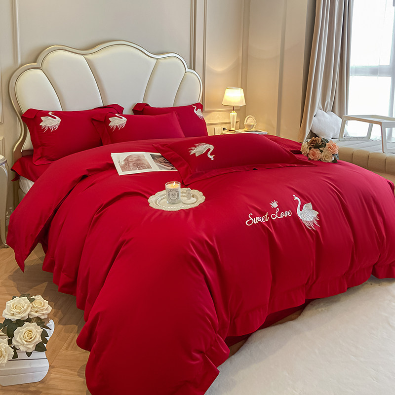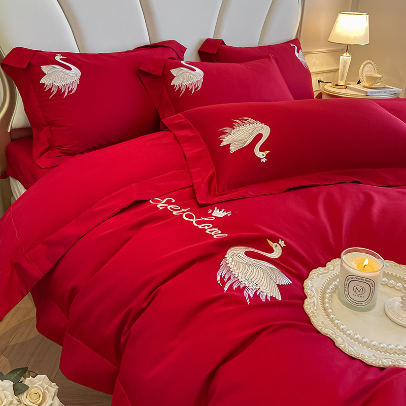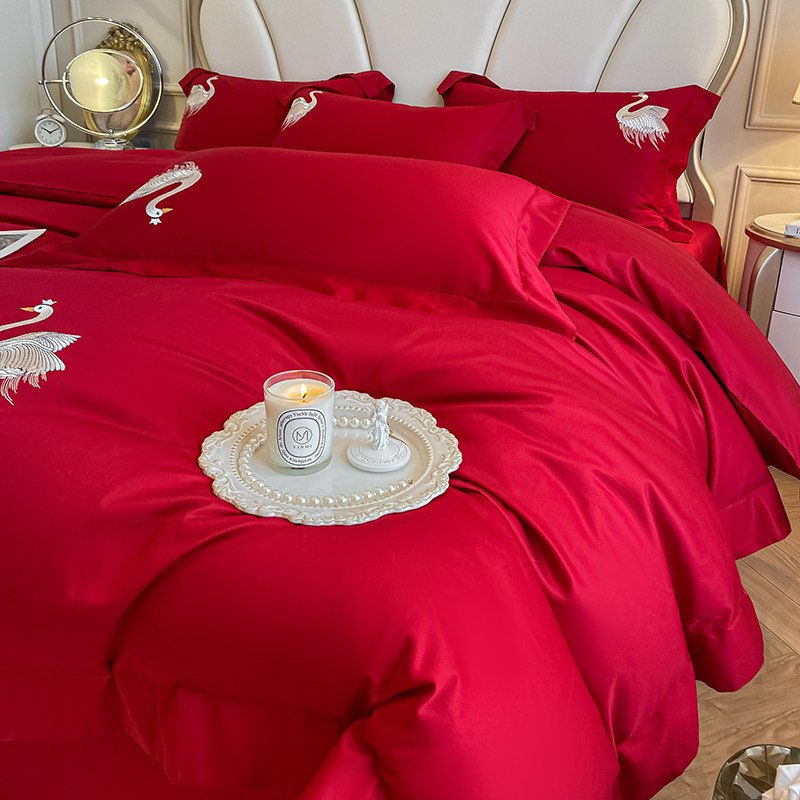 新中式婚庆床品60支长绒棉大红色双喜刺绣结婚被套床单四件套纯棉