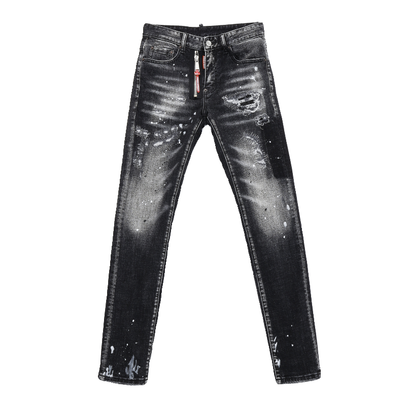 欧洲站新款男士烟灰色水洗泼墨涂鸦破洞补丁牛仔裤弹力修身小脚裤