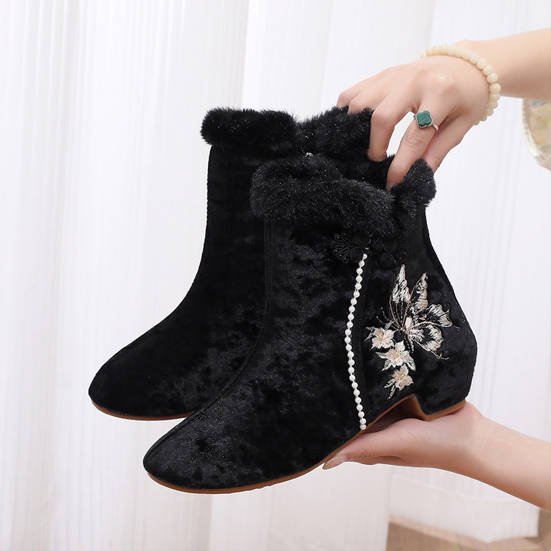 老北京布鞋女秋冬民族风绣花保暖加绒棉靴单靴平底盘扣女鞋高帮靴