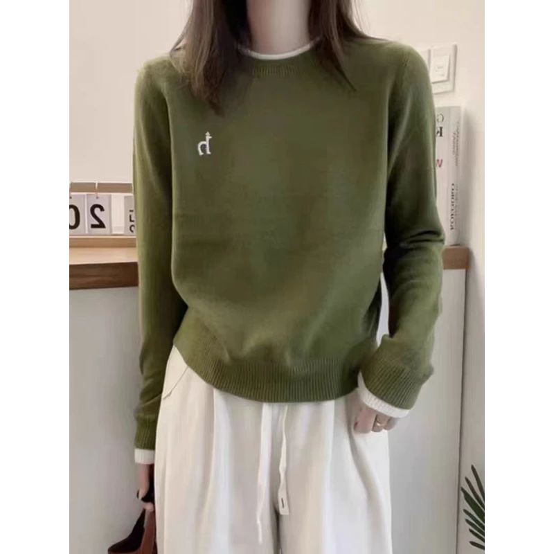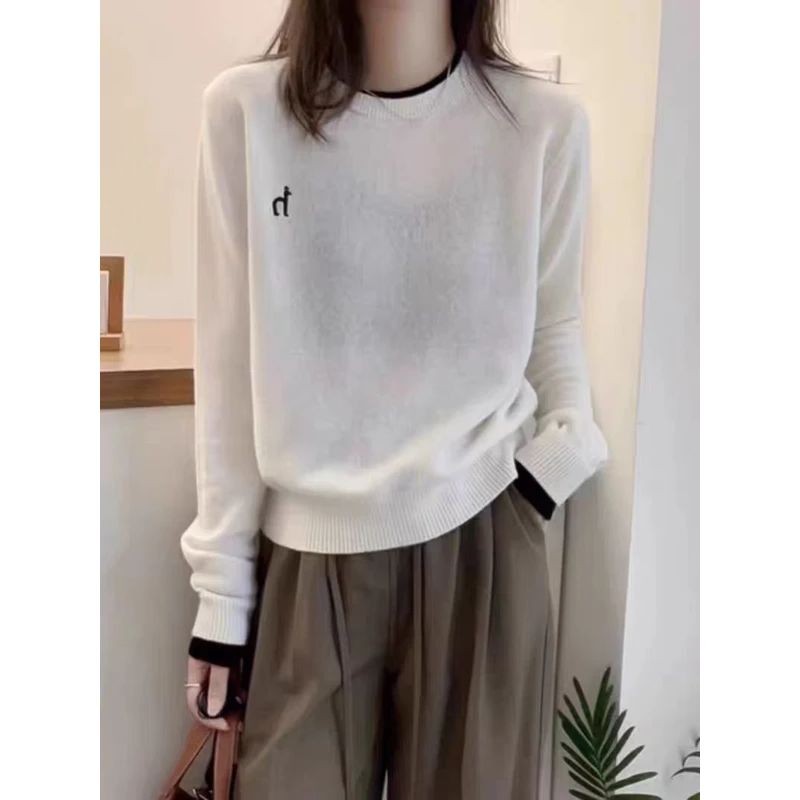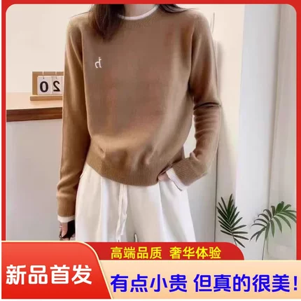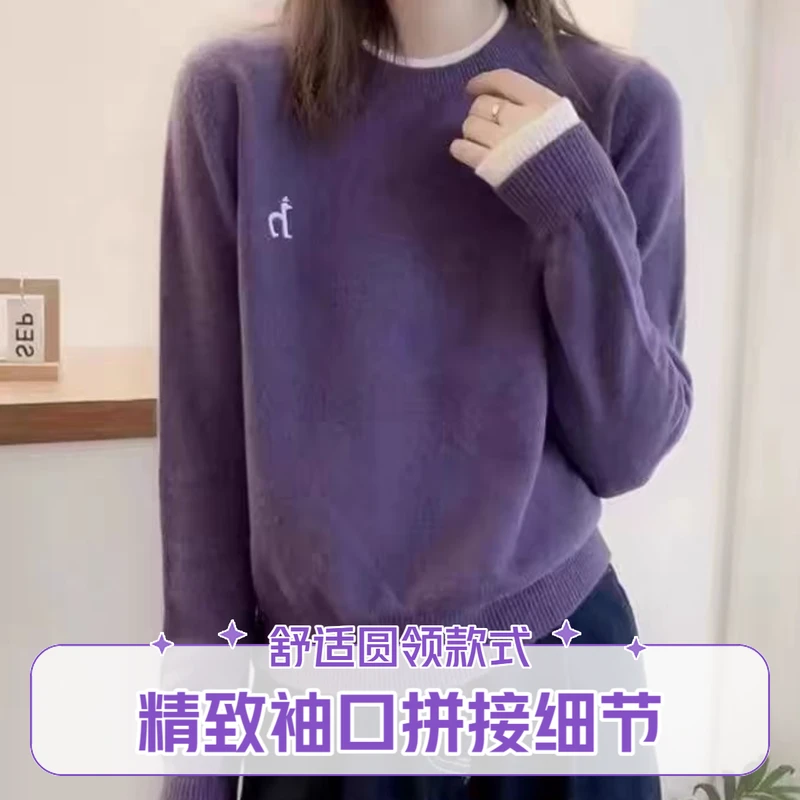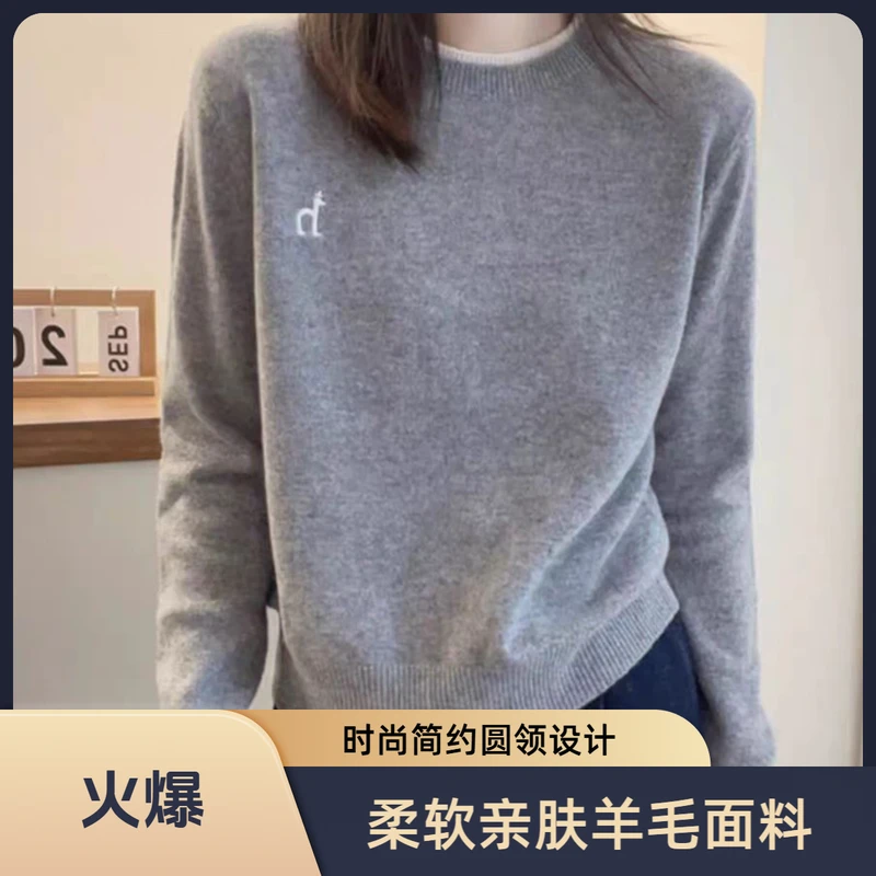 100%羊毛衫女士圆领时尚针织衫秋冬款外穿可内搭撞色宽松刺绣毛衣