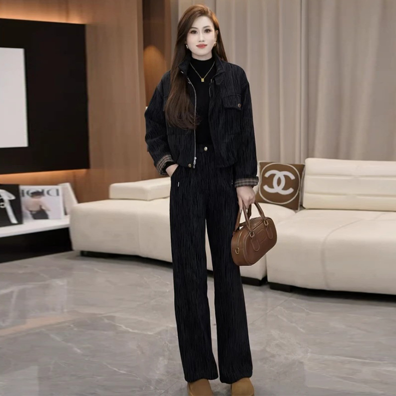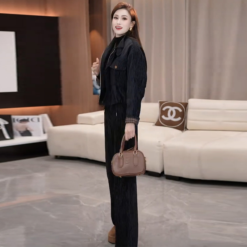 时尚夹棉加厚秋冬新款撞色外套短款+高腰阔腿直筒裤套装两件套女