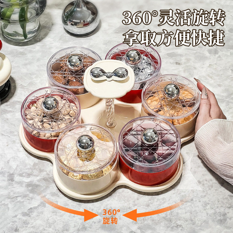 新年干果盘家用客厅分格零食糖果盒轻奢带盖零食果盘旋转收纳盘子