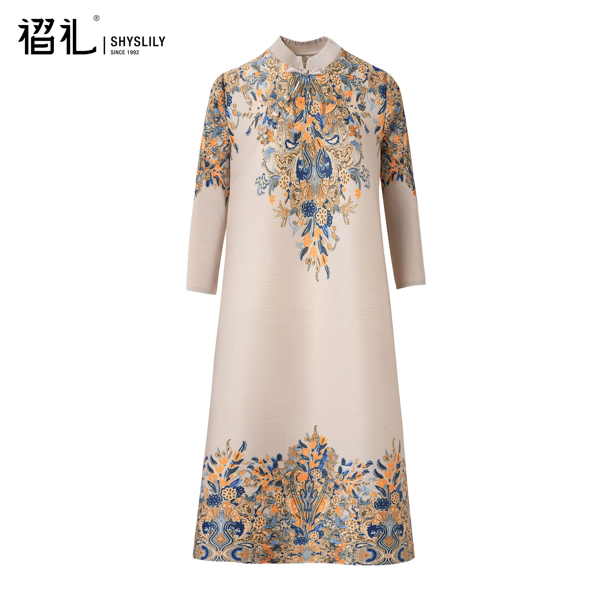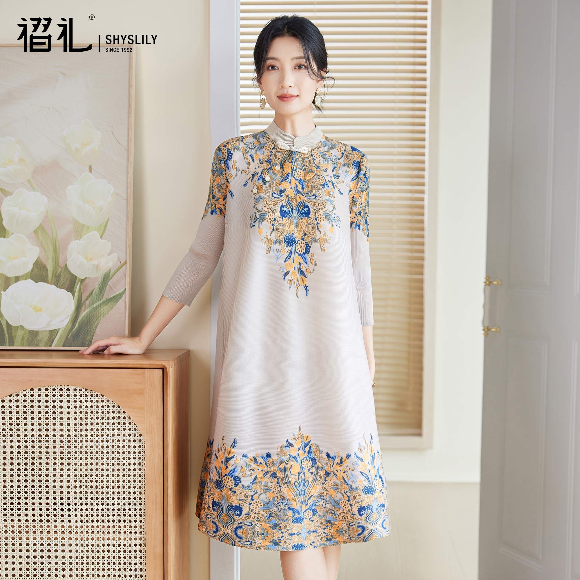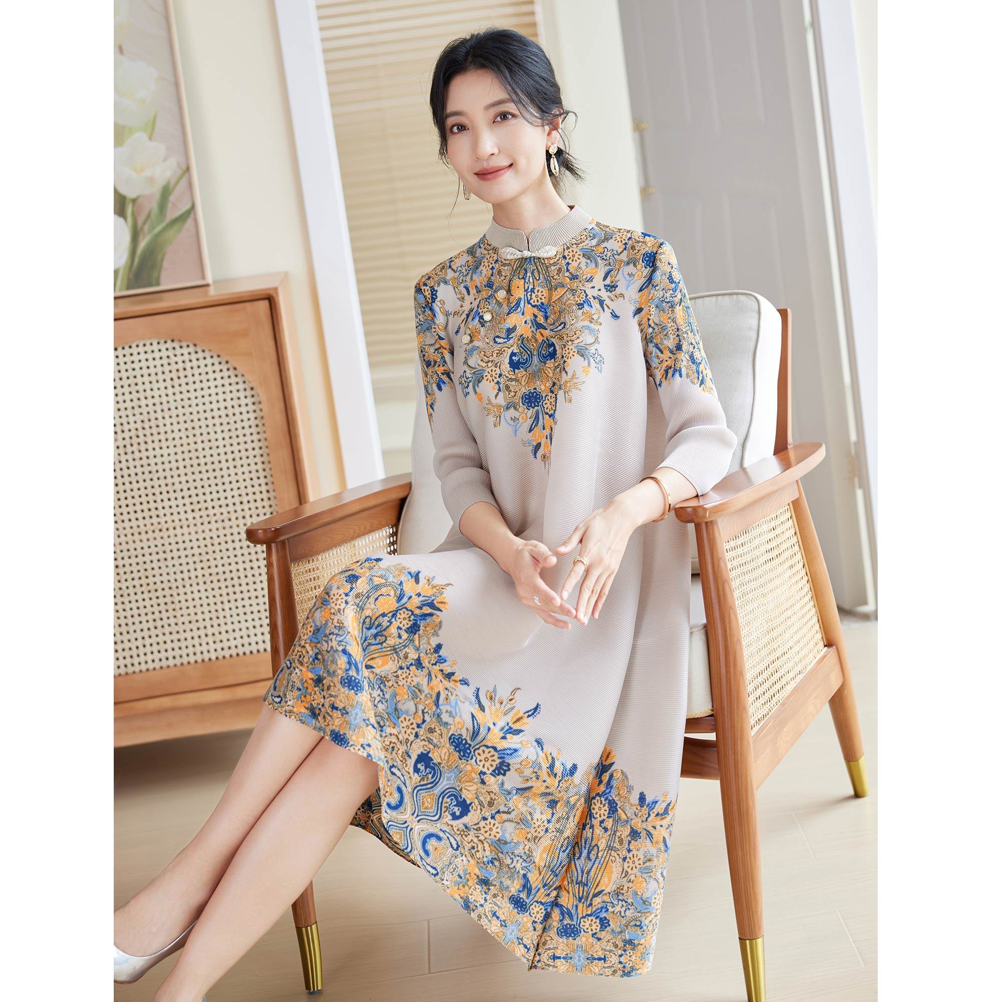 三宅端庄大气妈妈连衣裙春装新款洋气印花新中式褶皱大码女弹簧裙