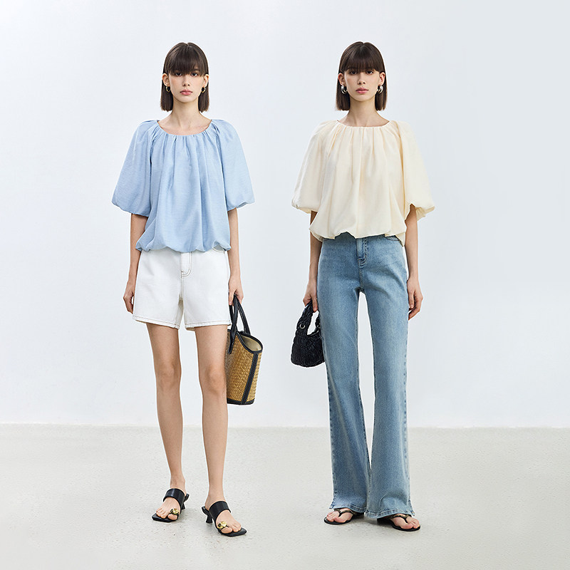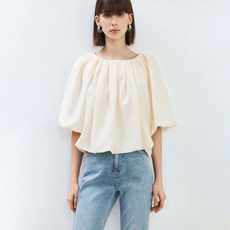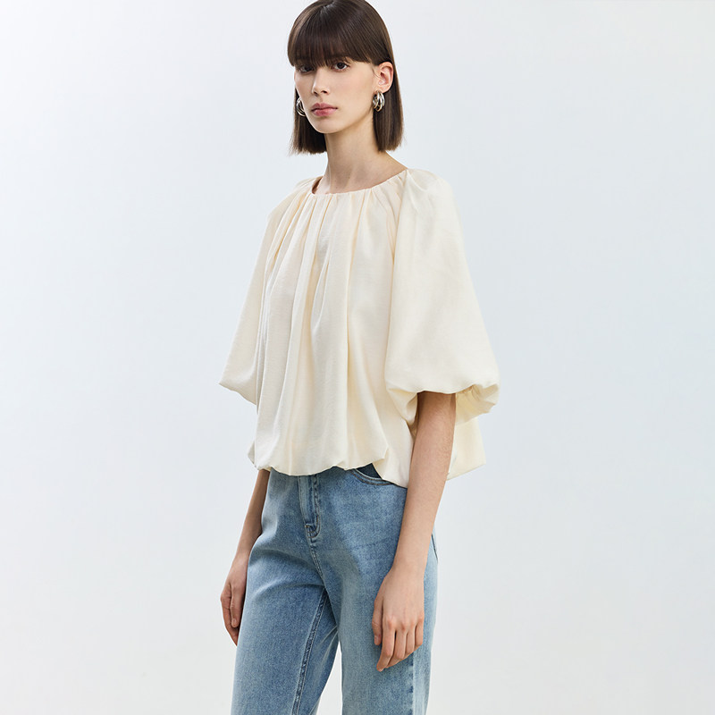 LILY夏新款女装含绵羊毛气质优雅通勤时尚垂坠感泡泡袖雪纺衫