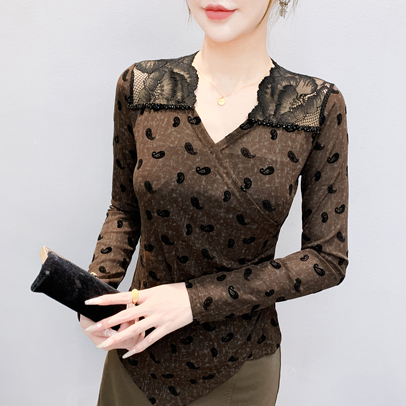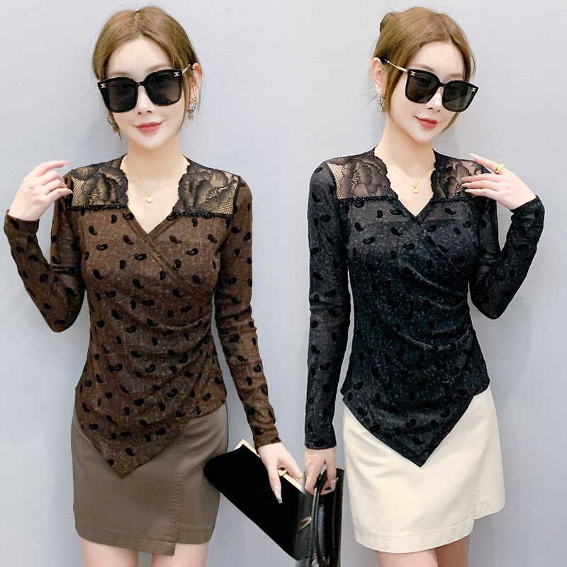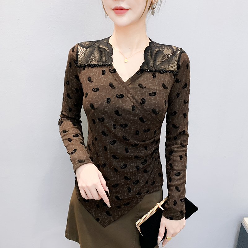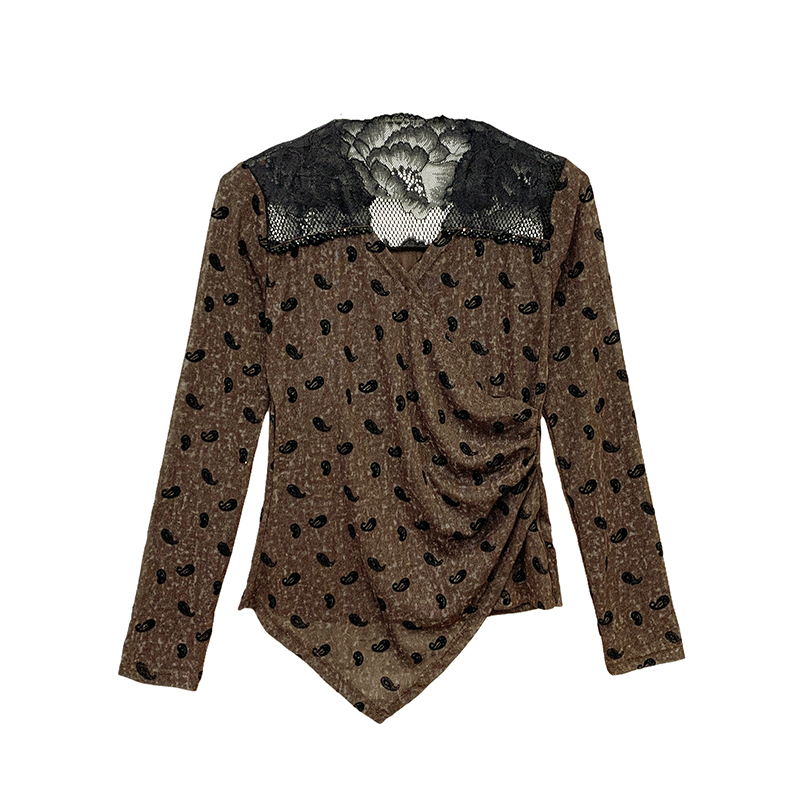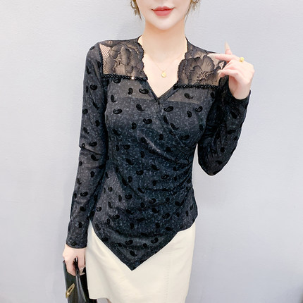 秋冬设计感V领蕾丝镂空订珠网纱印花不规则长袖t恤女减龄显瘦上衣