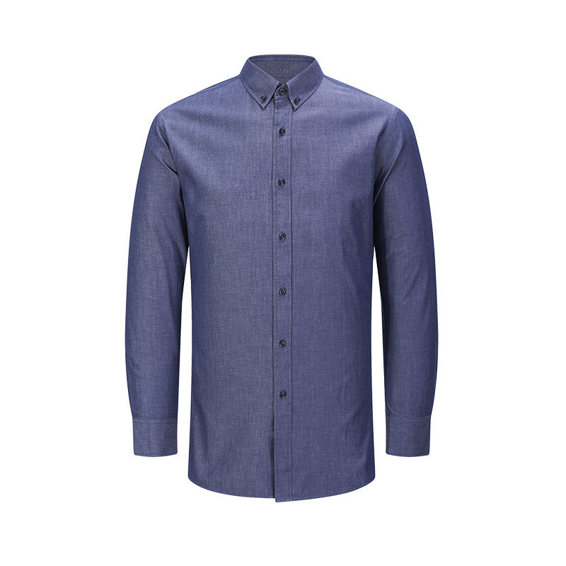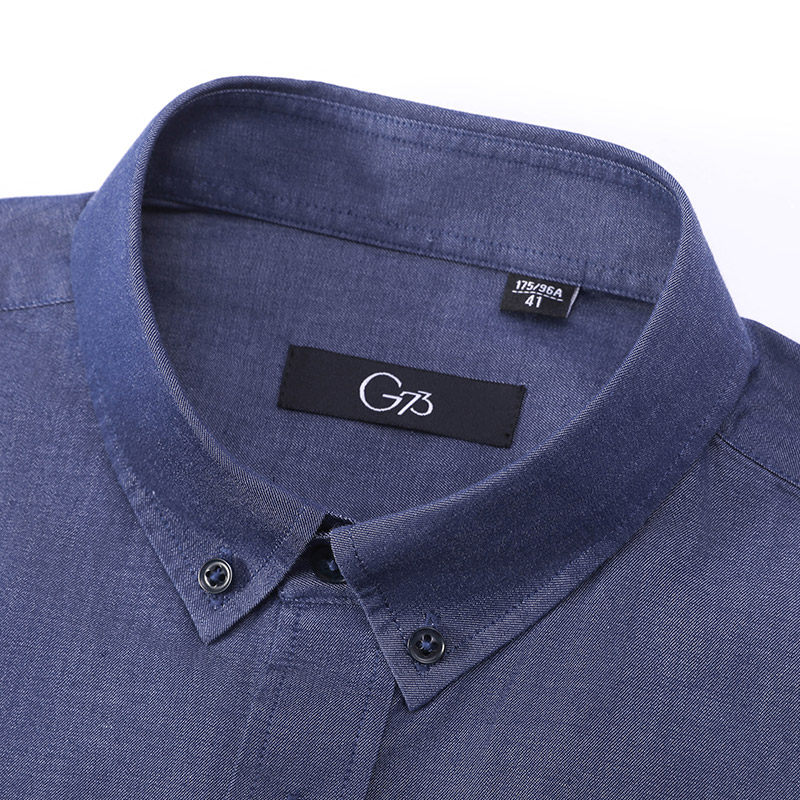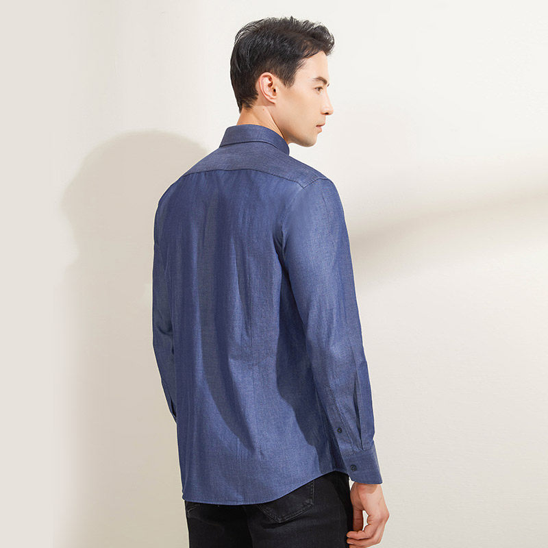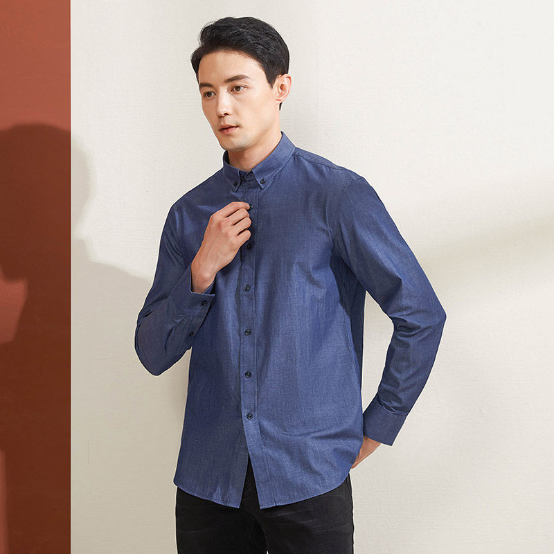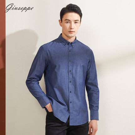 乔治白秋季男士牛仔蓝衬衫纽扣领修身长袖衬衣休闲时尚纯棉上衣潮