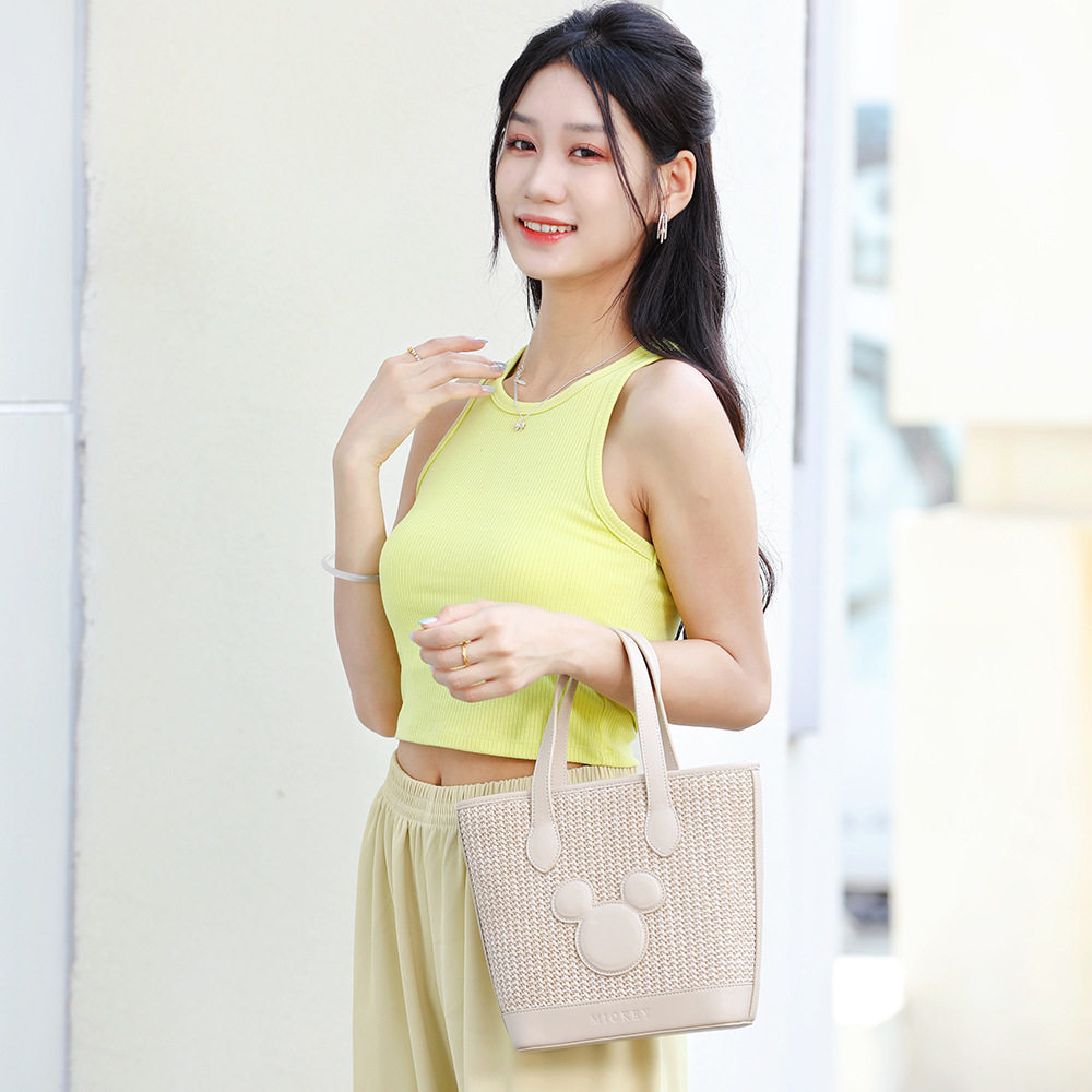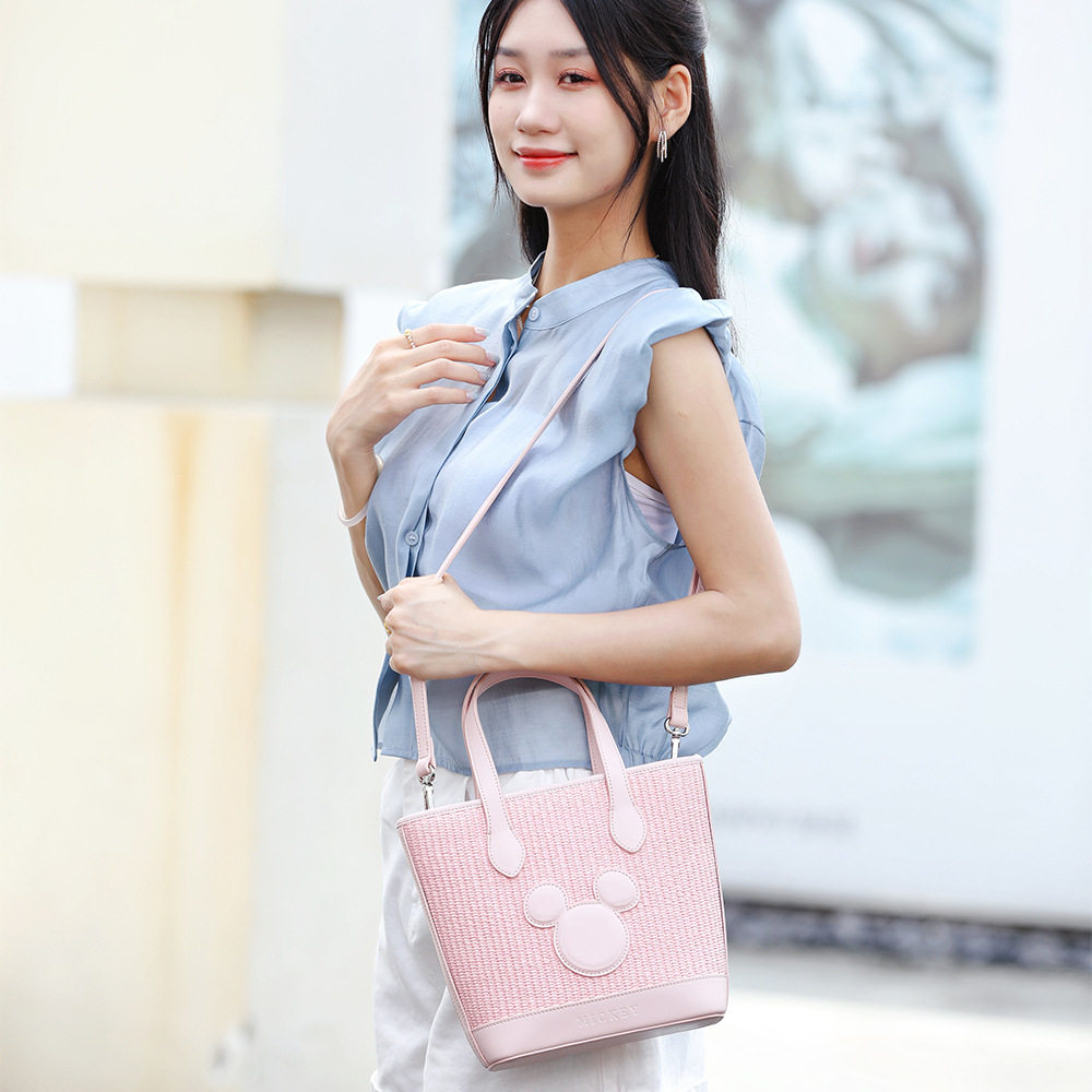 新款迪士尼少女手拎包米奇编织系列简约休闲水桶包手提肩挎两用包